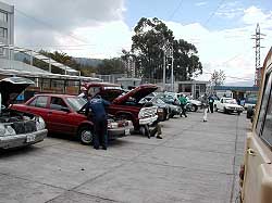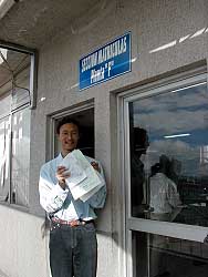 k日記エクアドル編 2000.6.8(木) 今日こそは、マトリクラを取るぞ!!と気合を入れて陸運局へ向かう。途中、整備工場で車を拾い、こんなに早くに来たのにもう長蛇のマトリクラの列に並ぶ。 コンコンコンと窓を叩く少女がいた。「セニョール、マトリクラを取るには、この三角反射板と救急箱、そして消火器が必要なのよ」と目の前に反射板と消火器と救急箱を差し出し、高い値段を言ってくる。え、そんなの聞いてないよ。本当に欲しいの?マトリクラの列に並んでいる運転手数人に聞いてみると、必要だと言う。高かったが、必要ならしょうがない。救急箱は車についていたので、反射板と消火器を買うことにした。 そうこうしているうちにスルスルと前の車が動き出した。どんどん前に進んで行く。陸運局の門が見えてきた。どうやら、いっぺんに20台程の車を駐車場に入れて数人の係員が順番に見るらしかった。どんどん陸運局に吸われて行く車。やっと私達が吸われる番がやってきたと思った瞬間、係員が赤い三角ポールを二つ私達の車の前にポンと置いてどこかへ行ってしまった。要は次の回にまわされてしまったのだ。 ああ、あんなに待ったのに、このまま昼ご飯に突入したらどうしよう。今日もマトリクラ取れないよ・・・肩が落ちる。が、心配は、ご無用だった。1回目の車が駐車場からいなくなったと同時に二回目の点検もすぐ始まった。 駐車場に乗り入れ、係員が車両の確認をする。まず、ナンバープレートを確認し、車種を点検。そして、エンジンナンバーにカーボンをこすり付けその上にセロテープを張り、よくこすってセロテープをはがす。同様に車体番号も控える。セグンド・バカ名義のマトリクラと比較して、合っていれば無事合格。エンジンの調子や排気量がどうのとか、ブレーキランプがつくかどうかなんて高度な事は一切聞かなかったし、必要だからと先ほど買った消火器や反射板などのチェックはないに等しかった。もちろん、無事通過した私達の車。書類をまとめて窓口へ走る。が、一足遅かった。 書類を見た窓口の係員「・・・3時に来てくれ。もう、休憩の時間だから」エーそんなあぁぁぁ。いくら言っても無駄だった。泣く泣く、陸運局を後にする。昼を食べて、急いで陸運局へ。 走って、マトリクラの窓口へ並ぶ。 3つ窓があった。看板にはみんな別々の事が書いてある。大きくマトリクラと書いてあったのでそこに並んで見た。正解だった。よく見ていると私達が並んだ窓口が終わった人が隣の窓口にまた並んでいた。そうか、そう言うことかそれならと、今の列にうめちんを置いて私は、隣の列に並ぶ。よく見ると、代行で並んでお金をもらっている少年がたくさんいた。いろんな商売があるものだと感心している間に一個目の窓口を終えたうめちんがやってきたので交代する。 そんなこんなで順調に3つの窓口を終了。それから、どこへ?路頭に迷っているとみんな上だ上だと親切に教えてくれる。階段を登り、マトリクラと書いた看板が張ってある部屋に入ると広い空間にたくさんの窓口が並んでいた。どこに並べば・・・うろうろしているとあっちだと指を差して教えてくれる。みな、親切だ。 下の窓口でチェックした書類を窓口に出す。何故か係員がうめちんを見て笑っている。横にいた係員も笑っている。はて?私達笑われることしたかな?なんて不思議な顔をしていると「君達、キトに住んでいるの?」と聞くので「いや、ツーリストだ」と答えると「ツーリストかぁ。で、住所は?」ツーリストに住所なんかあるわけないじゃないかぁと思いながらも「ホテル、スクレ。プラサ・サンフランシスコの近く」と答えると、窓口の係員が全員が大爆笑。 「こいつ、ホテルで登録しようとしてるよぉ」と腹を抱えて笑ってるやつまでいる。なんか、おかしいか?そして笑いながらも「電話番号は?」そんなもの覚えていないので「知らない」と答えるとまたも大笑いされた。そんなにおかしいかなぁ?それからは、係員が親切に次はココだとにこやかに誘導してくれた。 そして、マトリクラの紙をもらい、車体に張るステッカーをもらう。出来たマトリクラを配る窓口で待っていると、どこで聞いたのか知らないが「南米を一周するんだって?がんばってくれ。よい旅を」なんて言って来る奴まで現われた。 ぶっちょう面で出来あがったマトリクラを配る係員。名前を呼んですぐやってこないとすぐ弾いて次に行ってしまう、厳しそうな人だった。なのに、私達のマトリクラだけは、笑って引換証と交換してくれた。「ありがとう、さよなら」と手を振るとたくさんの係員が笑いながら手を振ってくれた。 マトリクラをパウチしてもらい、ようやく作業終了。ようやく、私達の車になったのだ。 昨日、約束を破ったカルロス宅に暗くならない内に急ぐ。そして、やっと見つけたカルロス宅は、急な坂道の一番上にあった。おりしも雨がぽつぽつ降って来ていた。道路は、滑りやすい石畳。勢