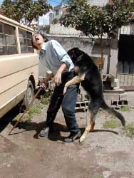 k日記エクアドル編 2000.6.9(金) スポンジとカーテン生地、それに、コールテンの敷物を買って、カルロス宅にお邪魔している車の元へ。 綺麗に掃除して、後ろの椅子を取っ払う。そこにスポンジを敷き詰め、コールテンの敷物を敷く。なんだか、立派な車に見えてきた。その脇では、カルロス宅の大きな犬、ジャフに腰を振られ呆然と立ち尽くすうめちんの姿があった。真っ黒になったシャツとジーンズ・・・ああ、洗濯物増えちゃった・・・ |