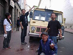 k日記エクアドル編 2000.11.7(火) キトの市街が見えてきた。約5ヶ月、南米をほとんど一周と言う形で、キトにもどってきた。最後の最後で事故など起さないよう、坂の多いキトの市内を慎重に走る。そして、ホテルスクレへ。 スクレの従業員カルロスが温かく迎えてくれた。が、ホテルスクレは満杯で日本人用の部屋がないと言う。どうにか、部屋をくれといったら狭くて臭い部屋に案内された。綺麗な部屋があるのだが、カギがかからないのだと言うので、しょうがなく臭い部屋に泊まることに。 取り合えず、牛次郎を駐車場へ。が、牛次郎が大き過ぎてホテルスクレ近くの駐車場には拒否される。新市街へ探しに行くがなかなか見つからない。いつしか外は真っ暗になり、オレンジ灯がほのかに光る市内を駐車場を探してさまよい走る牛次郎。そして、たどり着いた場所は、何だかものすごい豪華な建物の中庭。その建物の前にいた警備員に「この辺に駐車場ある?」と訪ねたら、「明日の朝6時に車を取りに来るならここに置いていいよ」と豪華な中庭を指差した。でも、6時は早いよ・・・すると「カギを置いて行け。そしたら朝6時にこの路肩に出しておいてやるから」でも・・・この車エンジンかからないんだけど?「じゃあ、押して出しといてやるから、さ、さ」こんなに親切な人怪しくない?でも、もう何も取られるものないしいいかぁ。と言う事で、この警備員のおじさんたちに牛次郎を預けることにして、宿に帰る。 宿には、本当にたくさんの日本人がいた。日本人と話しをしているうめちんと青山さん。でも、疲れた私は、ベットに横になる。なんの匂いだろう?ウーンこれは、塩だ、塩臭いんだ。部屋に入った瞬間、ものすごく鼻につく、でも、30分もすれば慣れてしまった。と、トイレに行く。部屋に戻る。塩臭い。30分で慣れるそして、また、部屋を出る・・・の悪循環が繰り広げられる。部屋を出るのは最小限にしようと誓った。 |