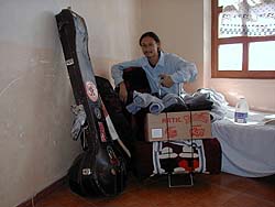 k日記エクアドル編 2000.11.27(月) スペインに行くにあたって、スペインに住んでいる友達に何か買っていかなければ・・・そう思った私達。早速、キトのショッピングメルカドへ吸われて行く。ヨーロッパは寒い所と聞いていた私達、お土産を買うついでに、靴、防寒具等を買いあさる。こんなに買って・・・また、荷物が増えたじゃん。どうすんの?まあ、ここまで増えてしまったら結局いっしょかな?などと、ビニール袋をたくさん引っさげ宿へ帰る。 明日に備えて、荷物を整理する。本当にたくさんある荷物を前にうんざり。「本当にこんなに持って行けるの?」ため息混じりにバックパックに荷物を詰めていく。そして、出来た荷物は、バックパック2個、ダンボール1箱、大きなボストンバック1個、シタール1本ケース付き、ビリンバウの棒1本、チャランゴ1本ケース付き、折畳式キャリー1個と、どれもこれもパンパンに詰まっているものばかり。しかも、どれもこれも相当重いか、かさばるものばかり・・・ 飛行機に乗車拒否されそうだ・・・されるかも・・・そして、キト最後の夜が更けていく |