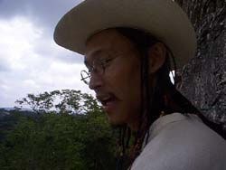 k日記グアテマラ編 99.10.14(木) ミニバスに揺られてガァテマラの雄大なジャングルを見ながらティカル遺跡に向かう。何処まで行っても緑がつづき、野生の馬が道の真ん中に立っていたりする。萱葺きの家がジャングルの中に点々と見え隠れする。なんてのどかなんだろう。 そんな道を二時間ほど走ると、ティカル遺跡の入り口が見えてくる、が、遺跡のいの字も見えない。入場料を払ってバスに乗りこみ30分ほど走ると駐車場やビジターセンターが見えてくる。やっとついたかと思いきや、バスを降りて運転手がアッチだと指差す方を見るがまだ遺跡のいの字も見えない。 運転手が指差した方へ歩き出すとジャングルの砂利道に入っていくが、しばらく歩いてもジャングルしか見えない。途中、チケットチェックを受けまたまたジャングルを歩き出す。しばらく歩くが何も見えてこない。道に迷ったのでは・・・本当にこの道でいいのかしら?と思ったとき案内板を発見。間違ってはいなかった。 やっとこ、ポツポツ遺跡らしい建造物や石碑などが見えてくるといきなりジャングルがぱっとと開けて巨大なピラミットが目の前にあらわれる。やっと遺跡の中心部に着いたらしい。遺跡までこんなに遠いのは初めてだがトレッキング気分でだいぶ楽しい。 4号神殿に登ると遺跡全体が見える。ついでに野生の猿の木わたりなんかが見える。ここは、人間を恐れない野生の動物の宝庫らしい。遺跡の中をあるってると頭の上を猿が行き交い、遺跡の陰からのそのそと狐が歩いて来たり、ちょっとした広場で見たこともない動物が人間とじゃれてたりしている。遺跡意外でも見所がたくさんある。この遺跡は、のんびり、ゆっくり見るのがいいと思った。約5時間も遺跡の中をうろうろしていたが当然、全部の遺跡を見ることもできず猿や変わった虫を眺め、蚊の大群の襲われて帰ってくる。 さんざんあるって疲れたのかサンタエレ−ナで会った日本人と酒盛りをしたせいか眠くてたまらない。ついでに昼間、蚊に襲われたところが痒くてしかたがない。もう、足はぼこぼこに段がついている、が、真っ黒に焼けているので見た目では分からない。今日は、痒さと戦いながら眠ることになるだろう。 |
