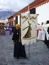 k日記グアテマラ編 99.10.31(日) アンティグアに来て街を散策したのは、これで2回目。全然、アンティグアをあるっていないことに気がついた。 十字架の丘に登ることにする。日曜なので登る人がいるんだろうなと思い、山道に向かったが、丘にたどりつくまでに誰とも会わなかった。 丘からは、アンティグアの街が一望でる。アンティグア富士が街の向こうに堂々とそびえていてアンティグアの街を裾野が包みこむように綺麗に流れている。小さい街だと思った。 丘を後にし、コーヒーのうまいカフェに行く。コーヒーを飲みながしばらくまどろむ。家ごとアンティーク博物館のカサ・ポペノエに行こうとてくてく歩いていると、途中、いろんなマントを羽織った怪しい集団が道の両脇にズラーと並んでいて先に進めない。 彼らはどうも聖職者らしくグアテマラ各地から集まってきたらしい。皆さん同じ札をつけている。見ていると「50周年」と見える。何の50周年?と思ったがそれしかわからなかった。地方の名前の入った旗を掲げて代表者らしき人がゆっくりあるってくる。その後ろは、香の煙がすごくまるっきり見えない。 何なんだろう、これは?と思っていると音楽が聞こえてきて、煙のといっしょに大きな山車がのッしのッしとゆっくりやってくる。山車の上には、十字架に張付けでいじめられたイエス・キリスト人形が横たわっている。目の前を通りすぎしばらく圧倒されているとなぜが皆のあとをついてあるっていた。 中央公園までついてきたが、だいぶ歩みがとろいので疲れてしまった。いたるところにポスターが張ってあったが私達のスペイン語の知識では、まったく理解できなく結局何の行事だか分からなかった。 今、梅ちんが笑いながら帰って来た。何?と聞くと、「グアテ人がウエスタンの女の子引っ掛けたらしいんだよ。で、そいつらこんな時間に押しかけてきて、部屋に入れてくれないてんでさわいでんの」そりゃ、入れてくれないよ。あきらめて帰ったほうがいいね。でも、居所教える方も教える方だよなぁと思った。 後書き 日記を書き終わって寝ようかと時計を見ると1時過ぎ、まだグアテ人とウエスタンはドア越しに口論している。まだ、やってると思ったが、だんだんグアテ人の方がエスカレートしていくようだ。 何かでドアを思いっきり叩いたり、窓をゆすったりしている。ドアを叩く音が激しくなると同時に口論も口論じゃなくグアテ人の笑い声や脅迫のようなしゃべりだけに変わってきた。こわい。中にいる奴らはもっと怖いんだろう、助けてあげたいけど何されるかわからないしと思っていたら。別のグアテ人が怒鳴りに来たので一旦落ち着いた。 これであきらめて帰るだろうと思った。怖いし、気になって眠れなかったがいつのまにか寝てしまっていた。寒さでふっと眼が覚めた。え・・・まだ、ドンドン音がする。もう、外は明るくなってきているのに、まだいるよ・・・しつこい奴らだなぁ。と、結局、よく眠れなかったのでした。 グアテ人の男は、しつこく執念深いんだとしみじみ思った。ちなみに梅ちんに聞いたら「朝までやってたのあいつら。全然知らなかったなぁ。しつこいよね」だそうです。 |