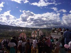 k日記グアテマラ編 99.11.1(月) 今日は、死者の日で祭日です。日本で言う、お彼岸とかお盆みたいなものです。みんな、手に手に花や弁当・・・日本で言う供物みたいなもんかな・・・をもって、お墓でピクニックをする日です。 サンアントニオ・サカテペクスと言う村で、特別なお祭りをするというので見学に出かけることにしました。 アンティグアからグアテマラシティー行きのバスに乗って、途中のサン・ルーカスでサカテペケス行きのバスに乗りかえて15分ほど山道を走り「あ、みんなで洗濯してるよ」と共同洗濯場が終点のサカテペケスの村に到着。 みんなが向かう方向にたくさん出ている露店を冷やかしながら着いて行く。20分位歩いた頃、ふと、遠くの空を見上げると小さい凧がいくつか飛んでいる。前方に目的の墓地が見えてくると空を飛ぶ凧の数も増えて行った。 参道らしきところに、直径10mはあるであろうどでかい凧が2つ飾ってある。スゲー、こんなの飛ぶの?なんて思っいながら人でいっぱいの墓地に足を踏み入れる。 山の斜面を切り開いただけの共同墓地らしく、斜めの所にぽつらぽつら建物墓がたっているのが見える・・・ん・・・あいつら墓石を足蹴にしてる?よーく見ると墓石の上に立ったり、その上でみんなで弁当食ったりしている。ちょっと罰当りじゃないかい?と思った瞬間、でこぼこ土道に花が置いてあるのが見える。皆の足元を見るとでこぼこがちょうど人型に盛ってある。ああ、これも墓だ。自分も罰当りだと思ったが、墓の盛り土で遊んでいる子もいれば、子供も大人も凧を揚げるのに平気で墓の上を走り回っている。 盛り土を削り取られ花がなかったらタダの土手?というところもある。これを見て罰当たりだとは思わないことにし、いっしょに凧上げを楽しむことにした。 ちなみに、小さい凧を買って上げて見たが、なかなか上がらず、だいぶ改造して上がるようになったと思ったら遠くに墜落。二度と帰らぬ凧になってしまいました。 ここの人達は、死者は死んだら空に飛んでくと信じていて、死者と交信するために凧を上げるんだそうだ。土手の一番下に直径5〜20m級の凧がびっしり並んでいた。空には、5m級の凧がふわふわ浮いている。高く上がれば上がるほど交信成功らしい。 と、墓の上を走りまわり、墓をぶっ壊し死者を眠りから叩き起し、出てきた死者とピクニックを楽しむ祭りでした。ちゃうよ。 |