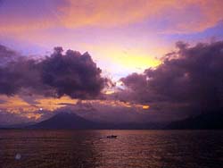 k日記グアテマラ編 99.11.9(火) パナハッチェルへ向けて出発。まずは、グアテマラシティー行きのバスに乗りサンルーカスへ。 本当は、チマルテナンゴ行きに乗ればいいのだが、バスの客引きオヤジが「チマルテナンゴ行きは少ない。しかも、チマルテナンゴからだともう満員で座って行けないからサンルーカスからパナハチェル行きに乗ったほうが絶対いい」といい張るので根負けしてバスに乗ってしまった。 サンルーカスまでの運賃をQ0.5値切って、自転車で2時間走った坂道をたった10分で走ってしまった。バスってすごい。サンルーカスの道沿いでバスがくるたび「パナハチェル!!」と大声で叫ぶ。そう叫ぶこと数回、「乗れ!!」と言われて、バスに乗りこみ車内を見渡すとガラン、ガランに空いている。 私達を乗せたバスは快適に走り出し、途中、ひょいひょいと人を拾って行く。チマルテナンゴについた頃には、立っている人はいないながらも、座る席はなくなっていた。あの客引きオヤジの言ってることはホントだったんだと、ちょっとあ然。 チマルテナンゴを出発して1時間、バスはどんどん山道を登って行く。曲がりくねった山道で、遅い車をひょいひょいごぼう抜き。途中、山間から湖が垣間見える。あれが、アティトラン湖?じゃあ、もうすぐパナハッチェル?と車窓を眺めて約30分、路肩がちょっと広いところでバスを降ろされる。 ここがパナハチェル?と思ったが、あっちだと指差す方をみると違うバスのオヤジが手招きしてる。また、バス乗るの?今乗ってきたのは、パナハッチェル行きじゃないの?と乗ってきたバスの行き先をよく見るとケツァールテナンゴ行きになっている。しゃあないので、手招きしているバスに乗りこむ。今度こそ、パナハッチェル行きだろうと思ったが、走り始めて10分ほどでまた、降ろされ、あっちのバスに乗るんだと指差している。 もう、走りだそうとしていたので急いで乗りこんだが、アイスやピーナッツ売りの少年がたくさん乗ってきて商売している時間があったので、そんなに急ぐこともなかった。 まわりのグアテ人に「このバスはどこに行く?」聞きまくり、今度こそ絶対パナハッチェル行きだと確信する。 バスは、くねくね曲がった傾斜20度はあろう坂道をとろとろ下って行く。眼下には、何処までも青く静かなアティトラン湖と緑の山々がその周りに高くそそり立っている。崖上からは、細い滝が勢いよく落ちている。そんな、急坂を何処までも何処までも降って行く。湖もどんどん大きく見えてくる。 やっと、パナハッチェルに到着。宿を決め、街を散策と思ったが、あまり大きな街ではないのでお土産屋台を冷やかしながら、湖を見に行く。 ちょうど、夕暮れ時。山の向こうに真っ赤な太陽が沈む・・・誰もが息を呑む瞬間、空も湖も赤く染まり、刻一刻と姿を変えていく。あまりの美しさにただ、ため息をつき眺めることしか出来なかった。そして、暗黒の闇がやってくる。 |