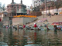 k日記インド編 2001.3.14(水) ガンガーは、穏やかだった。朝のほのかな明かりを受けて静かにたたずんでいる。南米で会った旅人が、久美子ハウス名物「カンコブネ」は、もうなくなったと聞いて、だいぶ残念だなぁと思っていたが、昨日も今日もシャンティさんが朝一番に叫んでいるのを聞いて、なんだかうれしくなった。せっかくなので、起きてボートに乗ることに。 小さな手漕ぎボートに乗りこむと、すーっとガンガーに漕ぎ出した。たくさんのボートがガンガーに出ていた。パーン、パーンと言う音が規則正しく聞こえてくる。ガート沿いで石に布をたたきつけて洗濯をしてる。その脇では、ガンガーにつかり身を清めている人がいる。対岸からは、オレンジ色の太陽がゆらゆらと顔を出す。朝日を浴びて、穏やかな空気が私たちを包む。ガンガーも建物もすべて同じ色に染まる。ここは、特別な場所だと言うことを思い知らされれる。でも、きれいだった。穏やかな気持ちになっていく。 ボートを借りて対岸へ行ってみる。今の時期は、干上がったガンガーの川底が対岸になっていて砂漠のような土地がどこまでも続いている。そんな何もない砂漠に死体が一体転がっていた。ズボンだけをまとったまるまるとした彼は、うつぶせに倒れていた。手足の先はすでになく、数匹のからすが肉をついばんでいる。私たちには当たり前ではない光景も、インドでは当たり前の光景として見えてくる。そして、彼の肉体は鳥についばまれ、川の流れに洗われ、魚についばまれ、消えてなってしまうのだろうか?人間とは、はかなく弱いものだと思った。 月が昇る。ガンガーに月の光がゆらゆらと映し出される。少し霧がかった対岸は、少しだけ岸がぼんやりと見えていた。その先は、闇の世界、恐怖は感じられない。美しく穏やかなものが漂う。・・・三途の川と言うものがあるならば、こんなところだろうか?呆然と眺める。ここは、不思議なところだ・・・ |