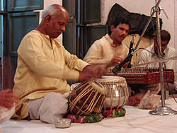k日記インド編 2001.4.1(日) 昨日、そのちゃんのシャントゥールのデビ先生に道端で偶然会った。話の成り行きかなんだかは分からないが「明日コンサートがあるんだが、聞きにこないか?「園子さんに教えたラーガをやるんだ。レコーディングもできるぞ」とお誘いの言葉。もちろん行きます。行きます。場所は?どうせ、その辺のミュージックセンターでしょ?と聞くと「じゃあ、明日の7時30分に我が家へ。いっしょに行こう」と言うことで、タブラのレッスンを終えて宿で夕飯を忙しく食べ、デビ先生のお宅にお邪魔する。ベルを鳴らすと白いワンピースの少女が「いらっしゃい」と銀色のボウル片手に私達を迎えてくれた。シャントゥールの幻想的な音色が家中に響き渡っていた。少女が指を指す部屋をのぞくとのするデビ先生が熱心に弦を叩いている。なんか、気合入ってるなぁ? ツーリスト用のコンサートでもこんなに真剣にチューニングしてるし・・・しばらく、座って聞いていることに。 「ちょっと待ってて」の言葉を残してどこかに消えてしまった先生の代わりに先生の息子がやってきた。「僕、タブラ習ってるんだ」お、聞かせておくれというと、ミニタブラを抱えてやってきた。叩き始めて絶句。その辺にいるミュージックセンターのオヤジくらいに叩いている。少しショックを受けた私。一体、いつ頃から習ってるの?「3年位かな」少し落ち込み気味の私に「君は、まだ始めて10日しかたってないじゃないか。落ち込むことはないんだよ。さ、もう、行こう」私も3年であれだけ叩けるようになるかな? 暗い路地を抜けるとダシャシュワメード・ガート前の野菜市場に出た。たくさんのバイクやリクシャ、のそのそ歩く牛たちが私達の行く手をさえぎる。器用にすり抜け一本の細い路地へ再び入り、すぐに一軒の家の門をくぐっていった先生。え、ここ? ミュージックセンタ−の看板も何もなく、ただの家に見える。首をかしげながら門をくぐり明かりが差す方へ・・・広いベランダにたくさんの自転車。光が灯るその部屋には、神様が奉られていた。祭壇に向かって腰を下ろす先生。その横には、すでに来ていたタブラ奏者の老人。そして、観客は額に赤いビンディと白い線がかかれたオヤジ数人と私達日本人3人。 厳かに演奏は始まったが、偉そうなオヤジがちらほら増えるばかりで、ツーリストのツの字も見えない・・・これは、どういうこと? 演奏もその辺のツーリスト用の演奏とは訳が違うプロの演奏。しかも神様に向かって弾いている。奉納演奏? 観客は私達じゃなく神様ってこと? こんな演奏会に私達みたいな異教徒が来ちゃっていいの? 少し遠慮気味に壁際で聞いていると「もっと、近くにおいで」と手招きしている偉い人。お言葉に甘えて前進。写真を撮っていいのか迷っていると「写真?撮れ撮れ」とニコニコしている。 演奏が終わると奉納してあったお菓子までお土産に持たせてくれた。なんとやさしいインド人。それにすばらしい演奏も聞かせてくれた。「これは、君達へのプレゼントだ」とニコニコしているデヴィ先生に感謝をする。こんな体験、なかなかできないよ。招待してくれてありがとう。スキップしながらすっかり暗くなった宿への小道を歩いていった。興奮冷め遣らぬうちに宿で起きていた人を集めて先ほど頂いた奉納菓子を星空の下でほおばる。口いっぱいに甘い汁が広がる。ああ、甘い、甘い、甘い・・・ |