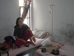 k日記インド編 2001.5.15(火) 寒さで目がさめた。まだ、あたりは暗い。掛けるものがないのでうめちんが脱いだ服を羽織る。これで少しマシになった。再び、眠る。ふと、目がさめると寝ているうめちんの手が私の点滴のチューブを押さえていた。彼の手をよけると何でもなかったように点滴が始まった。再び眠りにつく。明け方、また寒さがやってきた。目を覚ますと点滴ビンが空になり、チューブの中ほどのストップダイアルの下で止まっていた。うめちんをたたき起こし、看護夫を読んできてと頼むが「これをこうしておけば大丈夫」ダイアルを一番下のところまで押して、再び寝てしまった。ほんとかなぁ?半信半疑で手を動かしたりしてみたが水位が変わることがなかったので再び眠った。 ドンドン、ドアをたたく音。点滴チューブでつながれた私は動けないので、うめちんをたたき起こす。寝ぼけ顔で、カギを開けるとほうきを持ったおばさんがズカズカやってきた。そして、いきなり掃除をはじめた。銀色のボールから昨日使った注射器やアンプルビンを無造作に床にこぼし落としてほうきで掃いて部屋の外に出していた。アンプルビンなどは割れてしまっている。点滴の針など剥き出しのまま、床にほうり出される。ボールに入れている意味がないじゃないか・・・その後、濡れた雑巾でおおざっぱに床をふいていた。あれでは、裸足のインド人入院者や何より、掃除の人が感染病にかかってしまう。そんなことは、気にしないのか?二人で呆然と眺めるうちに看護夫さんがやってきた。点滴液とチューブの中が空っぽなのを確認して、きびすを返して部屋を出て行き、同じビンを持って帰ってきた。手際よく点滴ビンを取り替える。今日も一日これに縛られるのね・・・ため息が出た。うめちんは、私の着替えと朝食を取りに久美子ハウスに戻っていった。 うめちんが帰ってきた頃、二人の看護婦さんがやってきた。「部屋を変えましょう。ここは、4時になると暑いから・・・」そういって、私たちの荷物をずべて持ち、点滴ビンを持って私を誘導してくれた。その部屋は、前の部屋の倍の広さにクーラーのついた一等涼しい部屋だった。高そうな部屋だなぁ・・・ケチな二人には、そう見えた。 その部屋は、風は通るし、日が当たらないのでクーラーがなくても快適だった。昼ご飯は?と聞きに来たので、頼んでみた。やっぱり、カレーかね?そんな創造をしていたが、中華味のベジタブルスープにご飯とフルーツ。味も悪くなかった。夕飯は、病院食かこれがと思えるほど油っぽいチョウメン(しょうゆ味のヤキソバ)だった。でも、食べられないわけじゃないし、カレーじゃないのでいいことにした。 昼を食べた後、先生がやってきた。「検査をしよう」点滴をはずしてくれた。看護婦さんがこっちこっちと外から手招きをする。サイクルリクシャが現れた。どこかへ行くらしい。リクシャを降りて、小さな建物に吸われる3人。検査って何するんだろう?入り口でお金を払って、奥へ進む。たくさんのインド人が待っている。しばらく椅子に座って待つと、看護婦さんがドアの向こうから手招きをした。狭いドアを開けるとひんやりした空気が顔に当たった。涼しい・・・見れば、毛むくじゃらのインド人が横たわってエコー検査を受けている。私の番がやってきた。エコーの先生はどうやらインド人ではないらしい顔立ち。外人の私たちを見て「どうしたんだ?」と聞いてきた。「いや、何が悪いんだかわからないが熱が下がらないんだ、彼女。それで、今、入院している」「そうか・・・」ゼリーを腹に塗ったくってバーコード読み取り機のようなものをあちこちに当てはじめた。先生、なんだか渋い顔をしている。ものの数分で終わったが、先生の渋い顔が気になる・・・リクシャで再び病院へ帰ると、今度は血液を採るインド人が待っていた。5mlとメモリのある注射器いっぱいに血を採って去っていった。小さなビンを持ってやってきた看護婦さんが「これに尿をちょうだい」といって去っていった。あまりにも小さなビンなので尿を入れるのに相当苦労してしまった。 黄昏とともに熱が出てくる。先生がやってきて、再びアンプルを打ってくれた。このアンプルを打つとすぐ眠くなる・・・記憶がなくなった。 |