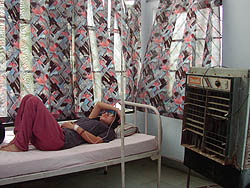 k日記インド編 2001.5.16(水) うめちんのお父さんとお母さんが明日、デリーにやってくる。うめちんは、デリーに迎えに行ってしまう。午後の列車に乗れば、明日の朝にはデリーへ着く。独りで不安だけど明後日には帰ってくるから・・・少し不安だった。 アンプルのおかげで熱は収まっていた。昼をいっしょに食べた後、彼は病院を出ていった。点滴下げの棒を引きずりトイレへ行き、時たまやってくる看護婦と話、ちょっとセクハラ気味の看護夫に嫌気を覚え、カンボジアの地雷の小説とベトナムの枯葉剤の小説を読みながら時を過ごす。 早く、帰ってこないかなぁ・・・ちょっと寂しかった。 |