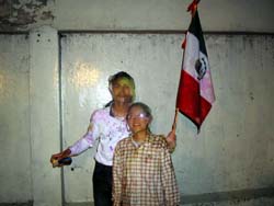 k日記メキシコ編 99.9.15(水) 1810年9月16日はメキシコ独立記念日です。15日の夜の9時くらいから前夜祭が始まり16日は昼ころから軍事パレードをしてその日は、祝日になります。商店や食堂なども休業するところが多いかな。ソカロで祝典をやりますが前日や当日はソカロは人でごった返し、ものを落としても拾えないくらいひしめきあうそうです。そんな中で、卵の中に紙くずを入れたものや生卵、最近は、泡スプレーや小麦粉、たちの悪いのになると鉛の卵などの硬いものなどいろんなものが飛んできて危険だそうです。特に外人とわかると集中的に責めて来たりして、メキシコ人の方が多いので勝ち目なんかあるはずがありません。 それに痴漢にあったり殴られたりなんて陰では当たり前。ソカロには医者が数名待機しているそうです。商店では、危険だからと酒類などの販売も禁止していて、買いそびれた梅ちんはがっくりしてました。ここの住民は、みんなで固まってソカロに出かけて行きましたが、私が体調がよくなかったのでソカロへは行けませんでした。が、近くの革命記念塔で花火を眺めながらメキシコの旗を買いメキシコ人でもないのに「ビバ!メヒコ」と叫んでいました。その後、近くの広場で野外コンサートを聞いていたのですが外人だとわかるやいなや、泡スプレー攻撃と卵紙ふぶき攻撃に会い、二人で泡のお化けに。だいぶ頭にきて反撃に出たのですが2対メキシコ人いっぱいでは、勝ち目なんかどこにもなく宿に逃げ帰る道すがらも泡の襲撃に会い全身泡だらけでやっとこ宿にたどりつきました。でも、こんなに泡だらけにされてもなぜか腹も立たず笑いがこみ上げてくるなんて不思議。ここに来て思いっきり笑ったような気がします。楽しかったね。宿に帰ると皆さんも散々な目に会ったらしく容姿は、ぼろぼろでした。水不足に悩むこの宿でシャワーの取り合いが起こったのも言うまでもありません。 |
