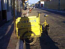 k日記ニカラグア編 99.12.27(月) この島ともお別れの日がやってきた。今度こそ行きの船の教訓を忘れず、飛行機で帰ろうと、宿のおばちゃんに見送られながら朝早く空港に向った。宿を出ると、隣の家の前で亀肉の即売会をしていてやっぱり立ち止まったうめちん。写真を撮ったり、亀の頭を持ったり遊んでいる。買いたそうな顔までしていたが、宿のおばちゃんに「早く行きなさい!間に合わなくなるわよ。亀肉買ってったってもたないから」と考えを読まれ早く行け行けと手を振っている。うめちんの事をもう息子のように思っているかのようだった。 チェックインを澄ませすぐ飛行機に乗りこむ。機体は20人位乗れる小型プロペラ機で調子よく出発。なかなかゆれもなく、青い海を眺め、飛行機の陰が見えると大はしゃぎ、快適なフライトだったが・・・やがて、うめちんにしがみつきここでお別れだねなんて言葉まで出てくるほど大きく揺れ、心がヒヤッとするほど腰が浮いた。そんなこんなが結構あったが無事マナグアに到着。いっしょに乗ったファミリーは、少し酔って私は、地に足がついてよかったとホッと心を撫で下ろした。 コスタリカへ向うべく、空港でタクシーを捕まえ、TICAバスのオフィスに向う。着いてみると、たくさんの人がオフィスのドアからあふれていた。そういえば、29日まで予約がいっぱいだったってコーン島で会った旅人が言ってたなと思いつつ列に並んで見た。結果、1時間待ったが乗れなく「もう、TICAバスはつかわん」と言ってオフィスを出てきてしまった。 途方にくれた二人。どうしよう?と考えた挙句、やっぱり私達にはローカルバスが一番!最近、贅沢になってるよ私達。と言うことで、初心に返ってローカルバス乗り場へ市バスで向う。今日は、だいぶ時間がお昼を廻っていたので国境の町の1つ手前のリバスまで行こうとリバス行きのおんぼろバスに乗りこむが、これまたとても混んでいた。年末なので移動する人が多いのだろうと思われた。手に手に大きな旅行かばんを引っさげバスに乗りこんでくる。 満杯のバスは、軽快に走って行く。と言うかすっ飛ばすって感じがする。途中、このバスに乗りたいと手を上げて合図する人が数人いたが運転手も手を振り返し、クラクションを数回鳴らして、はいさようならとスピードは一向に緩まない。予定より早くリバスに到着、このままコスタリカに入れるんじゃないか?と思ったが、リバスで一泊して明日朝早くコスタリカに行くことにする。 リバスの村は、のんびりとしていた。心地よい風が吹き、夕暮れの公園ではそよぐ椰子の木の下で子供達が遊んでいた。石畳の道路を馬車タクシーがゆっくり走り去り、店先で老人が居眠りをする。そんな光景が目に飛び込む。なかなか落ち着けるところだと思った。 なんだか、リトルコーン島に行った次ぎの日以来、喉が痛くてたまらない。咳と痰が多くなったような感じがする。今日は、だいぶ移動したし、喉も痛いし疲れた・・・早く寝よう。 |
