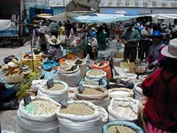 k日記ペルー編 2000.2.26(土) チバイと言う所にも温泉があるらしいというので、昼頃出発のバスに乗りこむ。日帰りは出来ないらしいので、荷物を担いでの出発。 やっぱり定時になっても出発しなかった。ボコン、ボコンと何処かを叩く奇妙な音がするばかり。ようやく出発したが、途中のガソリンスタンドでまたも1時停止。そして、ボコン、ボコンと奇妙な音が鳴り響くばかり・・・ やっとこ出発したが、スピードはそこそこしか出ない。その内、険しい断崖絶壁の凸凹道に差しかかる。折りしも、外は、深い霧に包まれ寸分先は、何も見えない状態。崖側には、なぜが、タイヤの後がくっきりと残り、至るところに十字架やケルンが建ててある。そんなことはお構いなしに、バスはがたがた言いながらのろのろと坂を登って行く。何処までも、何処までも登って行く。次第に息が苦しく、動悸息切れ、吐き気に襲われる。うめちんも頭痛がしてしょうがないと言う。相当、標高が高いらしい。いっしょにバスに乗ったイタリア人のガイドブックに「チバイへは、標高4000から5000m程度の山越えがあり、十分に注意が必要である」と書いてある。ただいま3500mくらいだろうか?高山病にかかったようだ。登りに登って平地に出ると、草と土だけの土漠が広がっていてリャマが悠々と草を食むっていた。そして、道路の隣に線路が見えた。フリアカ行きの高山列車らしい。こんなところ走るのかぁ、ペルー人は、よくこんなところにレール引いたもんだと感心してしまった。 バスは、更に高度を稼ぐ。雨季のためか道路の脇ちょが川のようになっている。道路も凸凹の悪路で、なかなか先に進まないがどんどん坂を登って行く。そして、辺りは、雪景色へと変化して行った。何処までも続く真っ白な大地。そして、霧の向こうには雄大な雪山が聳え立つ。行きつくところまで行ってしまったようだ。そして、やっとこ降りに差しかかる。ある程度、坂を下ると、雪はぱったりなくなり変わって今度は霧が立ち込める。そして、深い渓谷を横目に見ながらきついヘアピンカーブを下っていく。霧の向こうには直立に聳え立つ青い山々の連なりがかいまみえる。幻想的かつ雄大な世界が展開される。ほーとかへーとか言うため息が漏れるばかりであった。 チバイの中央広場に着いた時には、雨がしとしと降っていた。辺りも闇に覆われようとしている。バスを降りると早速客引きがやってくる。荷物を受け取らぬ内から手を引いて宿を見に行こうと言う。ちょっと、待ってよと言うが、あまり聞こえないらしい。営業熱心な客引きに捕まり程なく宿を決定。一息着くまもなく、今度は、ペーニャ(フォルクローレを聞かせてくれるところ)へ行かないかと熱心な勧誘。そして、明日の朝ご飯は、どうするだとか、カニョン・デル・コルカへのツアーの斡旋までありとあらゆる勧誘をしかけてくる。営業熱心なのねぇと感心したが、体よくみんな断ってしまった。その後も彼には何回かあったが、やはり営業熱心であった。 広場の横にたくさんの露天が並んでいた。やっぱり、安いご飯に限ると、全部覗いて、クルクルよく働いていたお姉さんの所で食べることにする。長径18cm短径12cmくらいの楕円皿にごはん、ちょうめん、サラダ、ポテトフライそして大きな鳥のから揚げか大きな鳥のスパイス煮がついて1皿3ソルとは、安い。しかも、皿からはみ出すほどのボリュームには驚いた。もう、入らないほどお腹が脹れた。 インディヘナの派手な衣装をまとったオバちゃん達が、似たような小さな屋台を並べていた。屋台には、たくさんのビンと草が入った釜が置いてあり、ビンは皆違うものが入っていて、釜はぐつぐつと煮立っていた。0.5センティーモ(約1.5円位)を払うと小さいビールグラスにレモンや蜂蜜、その他ビンから少しずつジョーっと注いで最後に釜の薬草湯をなみなみ注いで、さあ飲めと渡される。おいしいんか?これと半信半疑で1口すすると!!!おいしいー!!!びっくり仰天、甘さを押さえた蜂蜜レモンの味がした。コレハイケルヨオバちゃんと誉めるとニコっと笑って「もういっぱい飲んでよ」と商売、商売。二人で1杯で十分な量だったので「いえ、もう結構です」と丁寧にお断りすると「明日もいらっしゃい」とやっぱり商売、商売。 何処からともなく炭火焼のイイ匂いがすると思ったら、暗闇でボーっと赤く光っている台を発見。近づくと、インディヘナ衣装のオバちゃんが櫛刺し肉を焼いていた。とてもイイ匂いがするので、一体何の肉ですか?と尋ねると「アルパカよ」へええ、アルパカですかぁ、一本いくら?と聞くと、隣に座ってたオジさんが0.5センティーモと言い、当の販売人のオバちゃん曰く1ソルと。すると、オバちゃんはオジちゃんをギロリとにらみ何事か早口でしゃべって、私達の方に向き直り再び1ソルと答えた。くっくっくと笑いながら「オジちゃんが0.5センティーモって言ったけど」と突っつくと「知らないわ、1ソルよ