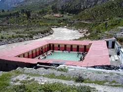 k日記ペルー編 2000.2.27(日) 朝ご飯に即席ラーメンを食べることにして、こんろに鍋をかけた。いつもと違いお湯が沸くのが異様に早く感じた。コンロの調子がよいのかな?と思いつつたまねぎを入れてるが、いつまでたっても煮えない。はて?なんでかな?と鍋を見つめているとうめちんが「ココは標高、3800mだからなかなか煮えないと思うね」と鍋に指を突っ込みながら言った。「熱くないの?」と聞くと「うん、熱いよ。でも、指は入れられる」と言うので私も突っ込んでみたが、そんなに熱いというほど熱くなかった。痺れを切らし麺を突っ込むが、麺が柔らかくなるのにいつもの倍以上の時間が掛かってようやくラーメンが完成した。 外の暖かいベンチでラーメンをすすっていると日がサンサンと降り注ぐ。しばらくすると、足の方にちくちくと傷みが走った。なんと、サンサンを通り越してザンザンに変わっていた。陽射しが刺さるように降り注ぎ、肌が露出した部分を容赦なく攻撃してくる。なんだコレハ、一瞬で赤くなったぞ。思わす、部屋に逃げこむ。標高が高いって不便なことが多いなぁとシミジミ思った。何せ1分で肌が焼けるモンなぁ・・・ メルカドを見て、村から4kmのところにある温泉へ向かう。コレクティーボに乗って、10分程走った山間にあった。ここの温泉は、源泉が80度以上あるらしく温泉卵が出きるほど熱いらしい。暖かい温泉!温泉!と入り口で生卵を買いこみイザ出陣!前のオバちゃんが50センティーモ払っていた。お、安いよーーとニコニコしていたら、奥からツーリスモ用のチケットを取り出し「1人4ソル」とオジさんが無造作に答えた。なに?50センティーモじゃないの?それにしたって8倍も取るのは解せないよなぁ。とぶつぶつ文句をイイながらココで入らないで帰るのもねぇとしぶしぶ払って入場。早速、源泉を見に行く。段々の湯畑がいくつかあり、側溝をお湯がザンザンと流れていた。それをたどっていくと、ちょっと高めの塀があってその中の一番奥でボコボコボコと音がして湯気がワーッと立っていた。お湯がなみなみと沸いていた。すごい湯量と熱さに感動。これは、期待ができるぞとうきうきしながら温泉へ向う。 一番手前の温泉へ入ろうとしたら、チケット売りのオヤジが一番奥で大手を振って手招きをしている。?オヤジが呼ぶ方へ行ってみると、ココに入れとカギを開けてくれた。よく見るとツーリスモと書いてある。・・・オヤジ、私達みんなと同じ所に入るからイイよといってローカルプールに行ってお湯をチェックするとあんなに熱い源泉のはずなのに何故かぬるい。3つあるプールどれを取っても同じだった。さっきのオヤジにもっと熱いプールはないのか?と聞くと、みんな同じだと言い、そして、だからツーリスモに入れって言ってるんだ。そう言うので、ツーリスモをチェックするとそんなに冷たくない。ははーん、誰もいないからお湯が冷めないんだぁ。よし、ココに入ることに決めた。 広い誰もいない貸切プールに二人きり。ただ、異様に深いプールは、外人用に出来ているらしく、182cmのうめちんが普通に立って顎までお湯がある。当然、私は常に浮かんだまんま。しかも、泳げない私は、階段に腰をおろし、腰から下の入浴がメインになってしまうのが悲しいがしょうがない。たとえ泳げたとしても、この温泉で泳ぐのは決死の覚悟がいるだろうと思った。泳ぐうめちんを見ていればよくわかる。15m位を行って帰ってくると、ゼィハァ、ゼィハァとすごい苦しいらしい。水の中で少し歩くっただけでも息が切れるくらいここは、空気が薄いらしい。しかも、高度が高いところで血行をよくしちゃイケナイのに血行がよくなる温泉に入って運動となればこちらから高山病を呼んでいるようなもので・・・泳ぐうめちんはチャレンジャーと言うことになる。「だいぶ高度順応したなぁ。もう、4000mの高地は大丈夫!!」とうめちんは言っているが、本当だろうか?と激しい息使いと青い顔を見ていると心配になってしまった。 帰り際、そこいら辺にいたお子様数人といっしょに楽しく温泉卵作りをする。源泉に卵を入れ待つこと5、6分。もうイイかな?と割ってみるがまだ生だった。うちで作る温泉卵は、沸騰して5、6分で出きるんだけどなァと思ったが、ふと朝のラーメンを思い出し、ココは80度位が沸点だと再確認してしまう。そして、再び、源泉に卵を入れて、10分程待つ。ぽつぽつと雨が降ってくる。1つ割れたのと、生だった1つは子供達にあげて、出来てるかどうか判らないが、引き上げて急いでコレクティーボに走る。間一髪、コレクティーボに乗りこんだとたんバラバラと大粒の雨が大量に降ってきて、数分で土砂降りに変化してしまった。客がいっぱいになるまで走らないコレクティーボの上からプールを見るとこんなに雨が降っていてもまだたくさんの人が入っていた。そして、お金がないから、子供達だけコレクティーボに乗せて、この雨の中歩いて帰ると言う