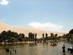 k日記ペルー編 2000.3.3(金) イカの郊外にワカチナと言うオアシスがあるというので行って見ることに。バスを捕まえようとあちこちで尋ねるが、皆さん言うことが違う。料金は?と聞くと「一人2ソル位かな」とあいまいな答え。さんざん暑い中、歩かされてばてばて気味の二人。結局、バスはあきらめてオートリキシャを捕まえてイザ出発。 郊外に向えば向うほど、景色が砂漠に変化する。そして、大きな砂丘が幾重にも重なって前方に現われたかと思うと、ポツンと赤い建物が見えてくる。ココだと下ろされたところは、本当に砂丘に囲まれポツンポツンとナツメ椰子が立つオアシスだった。自分のオアシスのイメージそのまんまであった。 早速、湖水浴開始のうめちん。体調の悪い私は、それを眺める。気持ちよさそうだな・・・と思い足だけつかることに。湖岸の丸太に腰をかけ足をポチャッと漬けると、なんだかくすぐったくなってくる。なんだ?と思ってよーく湖面を見ると、大量の小さな魚ドモが足を突っついている。なんとも、ほのぼのだなぁーと思っているとうめちんが横に座ると、うめちんの足に一斉に魚が向って行く。あらら、この魚ドモ、臭い足が好きなんだぁと口に出しては言えないがそう思ってしまった。しばらく、足をぽちゃぽちゃ動かし小魚と戯れていたうめちん。 「ウぎゃッ!!」突然叫んだと思ったら水面から急いで足を引っ込めた。なになになにどうしたの?きょとんとしてると「なんか足噛まれたー。なんかいるよぉ」足を見るとアキレス腱の所が赤く引っかき傷になっている。え、ここの魚って噛むの?と大騒ぎしていると、廻りにいた人達がケタケタ笑って寄ってきた。「あはは、そこはとても危険だよ。俺も手を噛まれてねぇ」と黒く太い腕をニューっと出して傷を指差す。そして「ほれ、ココに手を突っ込んでみれ」と湖に這いつくばり、座っていた丸太のしたを指差した。言われた通りおそるおそる手をすべり込ませるうめちん。「・・・!!うギャポッぷろポッ!!」あわてて手を引っ込めるうめちんを見て一同大爆笑。うめちん曰く「ここの丸太の下が大きな空間になっててさぁ、ちょっと大きな魚がいるんだ。そいつがガブチョって噛むんだよ」大爆笑の連中は、もう経験済みってことですね。はい。 それから、こいつを捕まえてやると小魚に体中をつつかれながら湖に這いつくばり、穴に手を突っ込んでは一同に大爆笑されること数回・・・結局、魚があきてうめちんの包囲網をなんなくすいーっとすり抜け何処かに行ってしまった。「ウキーッッ!!」と悔しがるうめちんが一瞬止まった。砂丘の方をじっと見ている。?その目線をたどって見る・・・・・・遠く壁のようにそびえる砂丘のてっぺんにポツンと人が座っていた。そして、ピョコンと立ちあがったかと思ったら一直線に斜面をすべりだした。へえええーサンドボードかぁ・・・と目線をうめちんに戻すと、さっきまで悔しがっていた顔が目がきらきらと輝いている。 そして、一直線にレンタルボードを借りに向ったのは言うまでもない。しかも、1.5時間で3ソルだと言うので1時間2ソルに値切って借りる。店のオバチャンが「日本では、雪の上でやるんだろ。これと同じボードかい?」いやぁ・・・1500mm×300mmの大きさに切ったパネコート仕様の15mmのコンパネに、何故か下に向って小さな羽が船尾に取り付けられていて、足を固定するためのマジックテープが2箇所ついているのみと言う、日本のボードとはお世辞にも同じと言えない代物である。そして「あんたたち靴は持ってないの?靴の方がいいわよ」と意味不明な事をつぶやいていた。 なんとなく体調の悪い私は、下で待っているつもりだったのに・・・無理やり手をつかんで砂丘の頂上に引っ張って行こうとする。わかったから、先に行ってていいよぉと犬のようにかけ上がるうめちんの後を追ってザクザク登り始める。 5分の1くらい登っただろうか?さらさらの砂に足をとられて歩きにくく、しかも、足を乗っけた先からさらさらと崩れて行く。そして、サンサンと照りつける太陽にばてばての私。もう、すでに半分以上登り切っているうめちんを仰ぎ見ながら休憩しようと斜面で歩みを止めると足からさらさらの砂の中に吸い込まれて行く。フーっと息を大きく吐く暇もなく足にチクチクと傷みが走る。地に足をつけていられないほどチクチクと刺さるようだ。虫かと思って砂の中で足踏みをして一生懸命足を出すが傷みが止まらない。何回か足踏みしている拍子にサンダルがホイっと抜け、素足で砂を踏んでようやく理解。痛いのではなく熱いのだった。 砂は、サンサンと降り注ぐ直射日光でカンカンに熱くなっていたのだ。ようやく、レンタル屋のオバチャンの言ったことが理解できたのだった。「こんな、所にいられるかぁ」と吐き捨てて、急いで斜面の下に避難する。ひりひりする足の裏を見ると真っ赤になっていた。足をパタパタ仰ぎながら砂丘を見上げると、ま