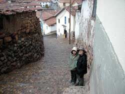 k日記ペルー編 2000.3.9(木) 朝3時起き。そして、空港へ。そして、クスコへ。 朝靄立ち込める海、そして砂の乾いた大地から緑がしっとりと輝く大地へと変わっていく。高くそそり立った山々を掠めながらゆっくりと茶色の町並みへ降りて行く。 小雨が降っていた。ヒンヤリと冷たい空気が息をも白くする。空港からタクシーでセントロに向う。アルマス広場で降ろしてもらい宿を探す。ここは、標高約3400m。空気が薄いくせにやたらと坂が多く、階段も多い。しかも、重い荷物を持っての坂道は何十倍も息が切れた。しゃべることはおろか足を上げるのさえ苦だった。私の廻りで客引き達がうるさく騒ぎたてていたがまったく耳に入らないほど。そのくせ、クスコの町がよく見える高台に宿をとった私達は、矛盾しているだろうか? 一眠りした後、散歩に出かける。小雨降るクスコ。なんともしっとりした情緒が漂う街並み。そして、街中がお土産天国であった。何処へ行っても声を掛けられ「買ってくれ」攻撃、そしてレストランの前を通ると「食っていけ」攻撃を受ける。辺が12角の石がある博物館の横の細い通りで、3人で12角の石を探そう大会をやることに。 どれが、12画の石かなぁ・・・とゆっくり石組みを見ながら歩いていく。丁度石組みの真ん中辺りに差し掛かったとき、向こうで私達を発見した少年が「12画の石はココデェース」と指を差しニコニコ手招きをしている。「言っちゃダメだよぉーー」とガックリしたうめちんの顔を見て少年は、キョトンとしていた。ああ、日本人が小沢山と居る観光都市なんだなぁと実感してしまった。 夜、暗闇にオレンジ灯が無数に光る。やはりこの宿にしてよかったと思った。 |