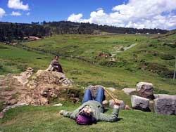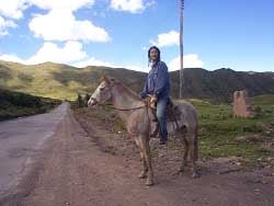 k日記ペルー編 2000.3.18(日) クスコ近郊の遺跡を見に行く。まずはサクサイワマンへ。タクシーで山を上がる。入り口で、クスコ近郊の16箇所の遺跡や博物館が見れる周遊チケットを売っていた。これを買うと、とてもお徳だし、しかも、学生割引で買うとさらにお徳だと言うので学生だと言張って安いチケットを購入。まず、遺跡見学開始。壁や石組で山のようになっている、サクサイワマン。遺跡を見るというよりクスコの街並みの方がすばらしかった。そして、芝生で寝転がり、青い空を見る。ああ、いい天気だなぁ。 サクサイワマンに来たには訳がある。ここで、格安で馬に乗れると聞いたからだ。そして、実際に入り口で声を掛けられたが、入り口のオヤジは高いことを言うので、自分たちで馬屋に出向いて直接交渉。4人で馬4頭、40ソル(約1200円)で、交渉成立。近郊の遺跡めぐりへ出発。初めての馬乗り、不安でしょうがなかった。 ポッカポッカポッカポカカ、ポッカポッカポッカポカカ平地をゆっくり歩く。これなら大丈夫だと思った。落ちる心配もなさそうだし・・・と思った瞬間、ガイドの少年が私の馬のお尻をペシっと叩いた。カッカッカッカッカッと少し駆け足。それにあわせて自分も揺れる。ひやぁーーーお、おちるぅうーーー。勢いあまって手綱を引っ張ると止まってしまった。そして、私の心と裏腹に草をハムハムハム。と、少年がまたもやお尻をペシ。ポカポカ歩き始める。「アミーガ、手綱をあまり引っ張らないでくれ。俺が大変だから」と言われてしまった。はい、すみません。今度から気をつけます。 ガイドの少年が馬を引いてくれる訳もなく、しばらく乗っていると操作がわかってくる。腹を蹴ると出発。軽く尻を叩くと走りだし、猛烈に叩くと猛ダッシュ。手綱を引っ張るとストップ。右手の手綱を引くと右へ旋回、左の手綱を引くと左へ旋回。なんとか言うことを聞いてくれるようになる。しかし、この馬ドモもう行く場所を知っているらしく何もしなくても勝手に進んで行くのだが、たまにサボるので要注意。うめちんなんか、しばらく乗ってなれたらしく、広い空き地で猛ダッシュなど調子に乗って遊んでいると「アミーゴ!!危ないから、ゆっくり−−」と少年に怒られる始末。「イヤー、猛ダッシュって楽だけど、恐いほど早過ぎて死ぬかと思ったよ」ははは、度胸が据わってらっしゃる。 サンサンと降り注ぐ遺跡を巡って、約3時間程でサクサイワマンへ帰ってくる。途中、道を間違えた私の馬は、とんでもない事をしでかす。なんと、目の前にあった高さ30cmくらいの塀をヒョコっと飛び越えたのだ。私も塀があるのは確認していたが、右へ旋回して・・・向こう側から本道へ降りようと手綱を右へ引いた瞬間、鞍が斜めに傾き、私のお尻が宙にふわっと浮き、そのまま置いて行かれそうになり慌てて手綱をしっかとつかむ。うわぁ、ひやぁぁぁぁ・・・何処から出しているか分からないような声が辺りにこだまする。そして、馬が塀を飛び終えるとそのまま、お尻が鞍のヘリに落ちずるっと滑って元に収まった。パニックでしばらく呆然。馬は、手綱を引いたのでストップ。何もなかったようにしらーと草を食っている。我に返った時には、少年が馬のケツを叩いて、叱咤していた。 そんなこんなで、馬を降りたときには、尻は痛いし、妙に疲れていた。馬って楽な乗り物だと思ってたけど、だいぶ思い違いをしていた私達。でも、楽しかったのだ。ただ、また乗りに来ようと言ううめちんの言葉は聞かないことにして。 |