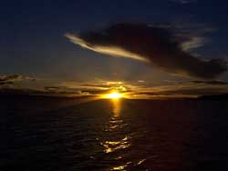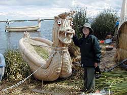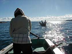 k日記ペルー編 2000.3.28(水) ティティカカ湖を8時頃出発。大量の食料と鍋、食器、ガソリンコンロを持ってタキーレ島へ1泊2日で釣りへ出かける。 ゆっくりとゆっくりと緑色の水面を滑って行く。山間を抜けると小さいと思っていたティティカカ湖の本当の姿が現われた。何処までも続く水面に青い空がみごとに映えている。青い空、白い雲のコントラストがすばらしく綺麗。次第に緑色が透明を帯びてくる。甲板に寝転がると空が異常に近いことに驚かされる。陽射しが容赦無く降り注ぐ。ココは、標高3900m。空が近いのもうなずける。 水面はいつのまにか透き通るような緑色に変わっていた。降り注ぐ陽射しを一身に受けて輝いている。幾重にも水面光が射し込み、光の線を作り出している。心が洗われるように澄みきっている。 緑色の水面に、わら色の建物がぽつんと見えてくる。近づくにつれてだんだん大きくなってくる。そして、人が行き交い、子供が走りまわっているのが見えてくる。あれが、アシで出来たウロス島かぁ。島に上陸して驚くのが、何もかもアシで出来ているということ。家に始まり、船、しかもいま立っている土地もアシで出来ている。そして、地面は、船に乗っているように揺れていた。そうウロス島は、人口の浮島なのだそうだ。私達が降り立った浮島は作って8ヶ月と若い島らしく、所々陥没していて、よく見て歩かないと穴にはまって大変なことになる。たぶん観光用に作ったものだと思われる。裸足で降り立った、うめちんとパチプロとチャリダー3人。寝転がったり、座ったり、気持ちよさそうだった。そして、アシで出来た船、ドラえもん号にも乗船。浮島から浮き島へ。短い距離だったが、普通の船より揺れず快適だった。 ウロス島を後にして、今度はタキーレ島へ。ますます、緑が深く澄みきってくる水面を走ること3時間。ようやく島に到着。入り口で入村料を払い、長い長い階段を登る。振り向けば、青いティティカカ湖が見渡せる。ますます空が近く感じるころになると空気が薄いのが感じられる。荒い息で昇りきるとアドベレンガで出来た茶色い集落が斜面にはりついていた。 そしてその廻りには、畑が段々に作られている。道の途中では、短い幾重にも重ねたスカートに頭に紺色の布をかぶった女性が糸を紡ぎ、その傍らで赤い帽子をかぶり、腹巻きにチョッキを来た男が編物に勤しむ。声を掛けると女は、ひそひそと小声で答え、男はにこっとはにかむばかり。吹き抜ける風が気持ちよくなんとも喉かな風景だろうか。 そうそう、男の帽子には意味がある。先の方が白く途中から赤くなっている帽子をかぶった男性は独身、全部赤の帽子は、既婚者のしるしなんだそうだ。昔からの伝統を守っている。ここは、他のペルーとは違う。そう、1つの国のようだと思った。 宿を探さねばいけない。その辺にいる人に聞いてみる。すると、うちにいらっしゃいと2人の男性が名乗出た。ついて行くと、一軒の民家へまねかれ、ココだと言われて覗いた部屋は、かび臭かった。でも、大きなアシのベットに毛布が数枚。ちゃんと綺麗なシーツが掛かっていた。問題無いのでココにすることに。 荷物を置いて、早速釣りに出かける。先ほど登った550段の階段を一気に降りて港へ。糸をたらすと人が寄って来るのは必ずでココもまれではない。糸を垂れて、数分。水の透明度の高さにハッと気がつく。底まで見えるし、魚がおよいでいないのもよく見えた。針につけた餌までよく見える。食ってないのもよく見えた。 その辺で見ていた子に「魚っている?」と聞くと「ああ、いるよ。でも、もっと向こうだ」と湖の真ん中辺を指差す。うーーん、ちょっと考え、重い錘に変えたうめちん。思いっきり遠くにほおって見る。そして「あれよりもっと向こうか?」と少年に聞くと「ああ、もっと向こうだ」とこともなげに答えた。 と、丁度よいところに手こぎ船がやってくる。交渉開始1分で1人1ソルで交渉成立。船に乗り込み、釣れるポイントに連れて行ってもらうことに。後ろに1本櫓がついた形のボートだが結構速く走る。島の側面にそってエッチラオッチラ漕いで行く。島の側面の急な斜面には、はりつくように羊が群れ餌を食べている。羊ってあんなところに住めるんだぁと初めて知った。 釣り場に到着と言っても、もう一つの港だが、魚は、さっぱりやってこない。やっぱり無理なのか?船乗り達は、笑って眺めている。船をもう一度出してもらうが日が沈むまでには結局、1匹も釣れなかった。そして、ティティカカ湖に日が沈み今日の終わりがやってくる。 急いで帰らないと・・・日が沈み暗くなる前に宿までたどりつかなければ・・・そう、湖の島には、共同の電気というものが存在しない。所々にソーラシステムを取りつけた家などがあるがそんなのはまれである。暗くなったら、ろうそく。いや、島の人達は暗くても道が分かるらしく、すたすたと歩って行ってしまう。やっと宿に着い