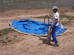 k日記ペルー編2 2000.4.18(火) ウルバンバ渓谷への道をバスは、ドンドン登って行く。ウルバンバ渓谷へ行くのはこれで二度目だった。遥か眼下には、クスコの茶色い街並みが広がり青い空とのコントラストが美しい。心和む風景にため息が漏れる。これから起こる恐怖の行為に心の不安は消えなかった。「大丈夫だよ。きっと楽しいから」こんな友達の声なんか聞こえようもない。そんな私をよそにバスは軽快に走って行く。 ウルバンバの町を過ぎ、オリャイタイタンボ近くの川辺リでバスは停まった。「Tシャツと短パン、水着が一番いいかな。それにサンダル。なければ裸足で良いです。ここで着替えてください。それと、何も持たないでくれ」とガイドの言葉に皆、着替え始まる。そして、不安と緊張が心にますます押し寄せ無口になる。黙々と着替え重い足取りでバスを降りる・・・菜の花が咲き乱れ、ホカホカと暖かい陽射しが差している。川も以前より水量が減り、川幅も小さくなっているように見える。あれだったら、大丈夫かな?呆然と川を眺め立ち尽くす。 不意に「おおーーぃ。こっちに集まってくれ」マッチョのガイドが手を振っている。ますます重い足取りの私を軽い足取りのうめちんが引っ張って行く。やけにうれしそうな顔のうめちん・・・何がうれしいんだか分からない。線路を越え、川岸へ下りていくと、マッチョのガイド傍らに青いゴムのボートが1艘出来ていた。そして、手際よく赤いヘルメットとゴアテックスらしきたぶん防水だろうと思われるぼろぼろの上着にライフジャケットをみんなに配っていた。私達も受け取り、そして、装着。最後にオールを一人1本、手渡される。「これで良いかしら?」何度も何度も点検。不安が消えない私は、装備チェックに余念がない。 青いゴムボートに腰を降ろした、マッチョのガイドはゆっくりと英語で説明を始めた。「始めまして・・・」から始まり、オールの持ち方から落ちたときの対応まで細かく説明してくれた。本当にこんなんで大丈夫か?まだ、不安ではある。が、ここまで来たからには乗るしかないと腹をくくる。 14人を7人ずつ、二つのボートに割り振られガイドを入れて8人でボートに乗ることに。「向こうのボート、シューシュー音がしてますよ。どっかから空気が漏れてますよ。こっちのボートでよかったですね」まったくだ、そう思った。8人でボートを持ち上げ川に降ろす。結構な重量がある。そして、先頭にヨギーと外人男性、その後ろに外人女性と大阪少年たけし君、その後ろに坊主のスーちゃんとうめちんが来て、最後に私とガイドが割り振られボートに乗りこむ。ゆっくりと岸から離れ、雄大に流れるウルバンバ川に漕ぎ出す一艘のゴムボート。私の不安をよそにラフティングが始まった。 ゴムボートは、ゆっくりと流されて行く。緩やかな流れの中で手始めに練習。前に進んだり、後ろに進んだり、そして右に旋回、左に旋回などしているうちに前方に白いうねりが見えて来た。第一の試練登場。 「漕いで、漕いで、漕いで!!ストーっプ!!」オールを膝に置き、試練に突っ込んで行く。目の前にいた友達がふいっと消えた瞬間に白いしぶきを上げた、ウルバンバの川が襲ってきた。ウワーー一瞬ひるんだ隙にお尻がつるんと滑って、体勢が崩れた。一生懸命ボートのへりにしがみつく。パニックかと思いきや「オールを放しちゃいけない!!」と結構、冷静な自分がそこにいた。そして、何事もなかったようにゆっくりとした流れに戻るウルバンバ川・・・うぬぬ、侮れない。 先ほどまで、あんなに良い天気だったのに雲が空を被っていた。不意に吹く風が濡れた体に寒さを与える。両岸には、牛がのんびり草を食み、釣りを楽しむ家族が手を振る。のどかな風景の前に現われたのは、恐怖の風景だった。前を行くゴムボートが忽然と姿を消したのだ。「彼らは、左のコースだから。僕らは、右のコースね」??右のコースは、そんなに恐くないって事?そうこう思いながら激流に突進。1つ目の滝は、難なくクリアーしたと思ったら目の前に大きな岩が現われ、行く手を阻まれた。「左に旋回!!」ガイドの号令に必死に漕ぎまくる。そのまま、まっさかさまに川に落ちる。水が容赦なくボートを飲み込み、私達をも飲み込んでいく。まだまだ、激流が続く中、私の目の前に座っていたスーちゃんは、どこへともなく消えていた。必死に漕ぐぎながら後ろをチラッと見ると、赤いヘルメットが激流の中にチラッと見えた。あわわあわ、落ちたんだ!!そう思っても、なすすべがない。 第二の試練を突破し、緩やかな流れになった。どんぶらこっこと流れるスーちゃんを無事救助した。幸い、ロープを掴んだ時、手にけがをしただけにとどまった。何度となくラフティングをやったことがあるスーちゃんは、ちょっと興奮気味で「ああ、面白かった」と答えた。うむむーー私だったらパニクッてただろう。 第三の試練は、難なくクリアー。これで、お