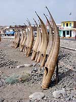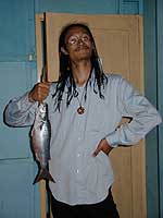 k日記ペルー編2 2000.4.27(木) 日が登ると同時にトルヒーヨに着いた。バス会社に程近い所に宿を取る。ベットにゴロンと横になったら睡魔に襲われそのままアウト。気がつくと昼過ぎだった。 コレクティーボに乗ってワンチャコ海岸へ。土の山の間を走ると目の前にぱっと海が広がる。人気もまばらな広い海岸に荒々しく波が打ちつける。ちょっとしたリゾートらしいが、さびれた感じがするのは私だけだろうか?この海岸のの名物に、葦の船がある。昔から伝統ある船で、たくさん立て掛けてあり、いまでも使われているようだ。 桟橋では、魚釣りをしている人達がたくさんいた。そこに混じって私達も釣りをすることに。釣りをしていた子供にえさを分けてもらい、早速、糸を垂れる。皆さん結構釣っているので今日は、期待が持てる。魚は、いることは居るようなのだが、餌を取られるばっかりで、一向に針に掛からない。 やっと掛かったかと思うと、食べたら可愛そうな小魚ばかり。結局、やっとこ食べられそうな大きさの物二匹をゲットしたが、これでは夕飯の足しにもならないので、隣でバカスカ釣っていたオバチャンにあげてしまった。潮風が冷たく頬に当たる。太陽がオレンジ色に変わり海へと落ちて行く。潮風に押されるように桟橋を後にする。 オレンジ色に照らされた海岸を歩く。大きな影が目の前に現われる。その先に、大きな魚を持った少年がぽつんと立っていた。「これ、自分で食べるのかい?それとも売ってるの?」「両方だ、買うか?」「いくらだい?」「3.5ペソ(100円位)」一番大きな魚を目の前に突出してそう言った。即買いだった。買ってきた魚を手にし「ボクガツッタンダゾ」と言う得意顔でカメラの前に立つうめちん。「丘漁師は、買物上手」などと言いながら魚をさばく。今日は、刺身だ。身が締まっていてなかなか美味しかった。やっぱり海は良いぁ・・・つくづくそう思った。 夕飯の後、香苗さんの所でもらってきた新聞を読んでいるうちに眠ってしまったらしい。最近、どうしてこう眠いんだろうか?不思議なくらいよく寝ているような気がする。気がついた時には、椅子にうなだれ新聞片手に、はずかしながらよだれまで流していた。ふと気がつき、ベットを見ると新聞に頭を突っ伏し熟睡しているうめちんが居た。私達、疲れてるんだよきっと・・・さあ、もう一眠りしよう。 |