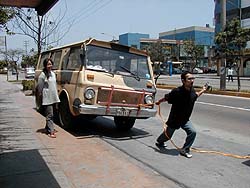 k日記ペルー編 2000.11.1(水) 楽しかった香苗さん宅を出て、北へ向かうことにする。「どうも、お世話になりました」とあいさつをして、すーっと出る予定だったのに、やってくれたよ牛次郎。押しても引いてもエンジンがかからない。見かねた香苗さんや、家事手伝いさんまで押してくれたのに、いつになくぐずっている。香苗さん宅の車からバッテリーをもらうがそれでも掛からず、ホームセンターで牽引ロープを買ってきて引っ張ってもらってようやくエンジンが掛かった。間一髪、ポコアポコのお客さんを乗せた大型バスがすいーっとやってきて、礼を言うひまもなく、香苗さんは、ぱーっと店に帰っていった。忙しい香苗さんに最後の最後まで迷惑を掛けてしまった。申し訳ありません。今度、車を買うときは、ちゃんとエンジンの掛かる車にします。はい。 そして、何事もなかったように出発。順調にリマの市内を抜け、砂漠しか見えないパンアメリカンハイウエーに乗り、北へ。 砂漠の街で昼ご飯を食べる。スープとメインの皿・・・口に入れたときちょっとかび臭いじゃがいもを除いては何の変哲もないペルー食。気にせず、じゃがいもを残してすべて平らげた私達。が・・・うめちんの体に変化が現われた。車に乗りこみしゅっぱーつ、と言う時点で、猛烈なくしゃみをしはじめたうめちん。鼻と目が痒くてたまらないと言う。牛次郎の後ろ荷台で、しばらく、くしゃみをしながら鼻をかんでいたうめちん。息が出来ない・・・とうめき声が聞こえたので、後ろを振り向くと、あやや、まぶたが腫れ、唇が腫れ、すっかり別人に成り果てていた。 夜になっても治まらず、宿を取った時には、38度の熱まで出ていた。喉ちんこがお化けの様に腫れあがり、顔は、ますます変形していた。やっと眠った彼を見て首をかしげる。どうしてのだろうか?以前もアレキパのバス停でそんなことがあったけども、こんなにひどくはなかったような気がする。さっき食べた昼飯がいけなかったのか? そういえば、うめちんのメインはジャガイモと貝の煮込みだったなぁ・・・うめちんだけかび臭いじゃがもをたくさん食べているし・・・それとも、煮こみの中に入っていた香辛料のせいかもしれない・・・いろいろ考えが結局原因は分からなかった。 |