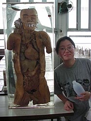 k日記タイ編 2001.2.1(木) チャオプラヤ川を走る高速ボートに乗ること3駅。大きな病院の一角を歩く3人がいた。病気?怪我?そんなのではなくこの病院併設の死体博物館と犯罪博物館を見にきたのだ。まず死体博物館へ。人っ子1人いない古い病棟の一角、この病院の研究者が集めた写真付きの骸骨、写真付きの臓器や死体の輪切り、ジャム双生児などの数々が並んでいた。このコレクションの数々でタイの医療はめまぐるしい進歩を遂げた・・・なんてことは無いような気がする。まあ、切り刻まれた死体を見ると「健康に生まれてよかった・・・」とほっとするばかりである。「ねえ、この間、来た時より展示品増えてる?」二回目の雀士に尋ねると「バーロー、増えてたら怖いじゃねーかー」まさか、今もコレクションはしてないよね・・・ そして、犯罪博物館へ。こちらは一転して、やや明るい感じ。見学者もたくさんいる。でも、展示してある代物は、銃弾が貫通した脳みそや腕、足、シャツや首をくくったロープにレイプ犯と死刑囚などのミイラ、犯罪に使われた凶器やいけない薬一覧など、など・・・実にえぐいものばかりだった。ところどころ写真だけ貼ってあって、空の展示ケースが置いてあるのは、展示品募集中なのだろうか?と思ってしまった。再び「ねえ、増えてる?」雀士に聞いてみる。「増えちゃいないけど、この国じゃ、こんなの集めるの簡単なんじゃない?」いやぁ、安全な国に生まれてよかったと思った。考えさせられる瞬間。 6時半発の南の島行きバスを待つ。やってきたのは、10人乗りのワゴン車。え、これで行くの?と思いきや、カオサン通りを出た大通りに大型バスが停まっていて、それに乗りかえるのだそうだ。セミ寝台の快適なバス。しばらくする、高速を南へと走りだした。バンコクを抜けても、道沿いに転々と家が並んでいる。そんな風景を見ているうちに眠ってしまったらしい。南の島にはいつ着くんだろう? |