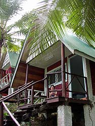 k日記タイ編 2001.2.3(土) 朝、山の斜面にへばりついたバンガロー宿へ行ってみる。空いていると言うので値段を交渉して早速移って来る。鳥のさえずりに少しヒンヤリした澄んだ空気、椰子の間から、エビの養殖池、前方に大きな奇岩が見える。すばらしい空間だった。 しばらく、その空間を味わった後、昼ご飯を食べて、桟橋があるビーチと反対側のビーチを目指す。奇岩に囲まれた湾。白い砂底が透ける程の海は、どこまでも遠浅が続いていた。照りつける太陽のもと、泳ぎ、ビーチに寝っ転がり、シュノーケリングをする。チクチクと太陽が刺さるように降り注ぐ。気がつけば、ジュージュー言いそうなくらい真っ赤になった肩・・・足も手も同じ状態になっていた。こりゃいかんと宿に撤退。が、時すでに遅し。バンガロー中に二人の悲鳴がこだまする・・・ |