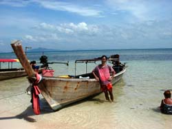 k日記タイ編 2001.2.6(火) すっかりインチキタイ人に変化したうめちん。真っ赤から真っ黒へと変化して行く肌をみると、白かった自分がウソの様である。今日は、何をしようか?馬鹿みたいに焼いちゃって、これ以上焼いたらキケンかもしれない。それに、ちょっと疲れたので中休みでもとろうと言う事で、宿でボーっとすることに。パソコンやったりしていたが、3時すぎ、バカの一つ覚えの様に泳ぎに行ってしまう二人。遠浅の引き潮で、海がなくなった湾で、はぜの大群を見て喜ぶ二人。そして、今日も焼きに焼きが重なる・・・オイ、荷物背負えるのか? |