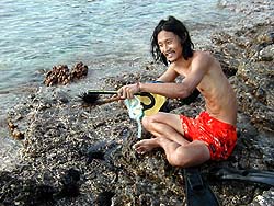 k日記タイ編 2001.2.7(水) 強い陽射しの中、てくてく歩いてロングビーチにたどり着く。そして、釣り糸をたらすうめちんとシュノーケル三昧の私。ふと海底をみると手足の異様に長いウニを大量に発見。ためしにタモに一つとって、釣り糸を垂れるうめちんのもとへ。うほうほ嬉しそうに針を壊し始め、ウニをバックリ開けてしまった。見れば、一面黄色、たくさんの卵巣が詰まっている。「これは、釣りなんかしてられない」フィンをつけて海に消えて行くうめちんを見守る事、数分。あれやあれやと、15個ほどウニを岩場に投げてよこした。そして、外人が見守るなか、ウニと格闘する二人。おかげで大量のウニが取れた。 このウニ、毒とかないのかな?まあ、食べてみれば分かるヨ。うきうき宿に戻って、ご飯の準備。ゆうに4人前はあろうウニの量をタイ米にたっぷり乗せて口いっぱいにほおばる。日本のウニには負けるけど、ぷりっ、トロっとした感触に濃厚な味。無言で食べる。 数分後、毒が廻ってダウンなんて事はなかったらしい。やっぱり、南の島っていいなぁ・・・後で知ったのだが、コ・ピピは、国立公園の一部で自然を保護しているのだそうだ。そんな事とは露知らず・・・大変なことをしてしまったのかもしれません。あちゃっちゃ。 |