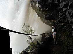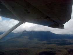 k日記ベネズエラ編 2000.7.1(土) 2泊3日のカナイマ国立公園を見るツアーはセスナに乗る事から始まった。上空から見たジャングルには、びっしりと緑が生えていた。その緑の合間を縫って雄大に流れるオリノコ川と緑がはだけた赤い土地が所どころにある。 薄曇が私達の視界を遮る。切れた薄曇の合間からどこまでも続くジャングルが見える。大きな湖があった。遠くに薄くぼんやり台形の山が見えてきた。そして、また薄曇が視界を遮る。突如、横に現われたテーブルマウンテン。切り立った山壁、大地のような頂上に圧倒される。緑の絨毯からひょこっと突き出た茶色のテーブルマウンテンとテーブルマウンテンの合間を縫って飛ぶセスナ。よく見れば、テーブルマウンテンの上は、縦に亀裂が入ったり、岩が立っていたりと凸凹だった。その亀裂から、頂上に溜まった水が流れ出し無数の滝を作っていた。 そして、一際高くそびえるテーブルマウンテンが目の前に現われ回りこむようにセスナが飛ぶ。テーブルマウンテンの一角が丸くへこみ、そこから大量の水が流れ落ちていた。下まで届く事はないその水は途中で霧となって大地に降り注ぎ、円形の虹までも作っていた。エンジェル・フォール、声も出ないほどの感動が胸に込み上げる。すばらしい。2,3回エンジェル・フォールの前を飛びその場を離れ、カナイマの空港に向かった。 カナイマのツアーセンターらしき所でお昼を食べ、水着に短パンTシャツ、サンダルに着替えて、余分な荷物をトラックに預けてカナイマ国立公園に足を踏み入れる。 ものすごい量の水がものすごい勢いで流れ落ちる滝が見える。その湖をボートが走る。滝の飛沫が遠く離れた所を走るボートにまでやって来る。横波を受けて、すでに濡れているボートの乗客たち。対岸の島に着いた時には、頭からつま先までびっしょりだった。 ボートでたどり着いた所からしばらく歩く。と、どこからともなく地響きのような音がかすかに聞こえて来る。近づくに連れてものすごい轟音に変化してゆく。頭上の岩から水が滴り落ちている。目の前に轟々と流れ落ちる滝が見えた。ものすごい水量だった。あまり近づくと滝かどうかも分からないほど、前面に水が噴出し、大量の水飛沫が発生していた。自然の階段を降りる先は、水飛沫と頭上からの水で前が見えなかったが、看板にエル・サポと書いてある。頭上から看板をすぎると寸分先は、水飛沫と霧だった。いっしょのツアーの人達が服を脱いで水着になっていた。なぜ?こんな所で、水着になるの?ここじゃ泳げないよ・・・何故かガイドも服を脱いでいた。ガイドが、何かを言っている。でも、轟音でよく聞こえない。 とにかく、このままでいては、バックも洋服も何もかも濡れてしまうので私達も洋服を脱ぐことに。するとガイドが寄って来て、ビニール袋を差し出す。「これにカメラを入れて口をしっかり結んで、水が入らないようにして。しっかり持ってついてくるんだよ」そう聞こえたので、カメラをビニールに突っ込みしっかり縛る。で、どこ行くの?とガイドを見るとよし来いとばかりに手招きをして、水飛沫の中へ消えて行った。・・・うそ、この滝の裏くぐるの?恐怖で足がすくむ。後ろではしゃぐうめちんに背中を押される。本当に行くんですか?誰かに聞きたい心境だったが「行くよ」と言う答えしか返ってきそうに無いのでやめた。ココは、腹をくくるしかない。 たぶん、中は岩がすごくえぐれていて、洞窟のようになっているに違いない。こんなにすごいのは入り口だけだよねぇ・・・そんな事は、無かった。滝の裏にはたしかに道らしきものはあった。水が少なければ、楽しかろう。が、今の水量だと、窪んだ道にものすごい量の水飛沫が横から叩きつけているし、その窪にぶつかった本流が道にぶつかり逆流していて、足場がまったく見えない。ちょっと間違えば足をさらわれて滝に転落なんて事にもなりかねない。 当然、前は見えなく、ものすごい量の水を上から横から叩きつけられる。こんな所を進めるはずもなく、へたりこんでしまいそうだったがそれも出来なく、なんとしても前に進む他ない。ものすごい台風の日に堤防を歩くそんな感じがした。どうして、こんな所を歩かなくちゃ行けないんだ?すごいと言うより恐怖だった。目の前が開けたときには、生きていてよかったと本当に思った。ほっとした瞬間、対岸に洋服を脱いできたことを思いだし、またブルーになった。ココをまた戻るんだよね・・・泣きたくなった。さすがのうめちんも真顔で滝の裏から姿を現し「ここは、すごい」とものすごく感動していた。 先ほどの滝より大きいと言う、エル・サポを眺める。こんな滝の裏側を通って来たんだ・・・言葉もでない、帰ることを考えるともっと言葉が出ない。 帰りの時がやってきた。滝の裏の前で立ちすくんでいると、「岩に頭をぶつけてけがをするからそっちの手は岩を触っていてくれ」そう言って、ガイ