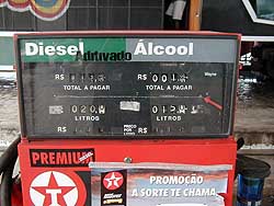 最後に、ブラジルのガススタではブラジルでしか見かけない燃料が売っています。それはなんとアルコール。アルコール燃料はブラジルでいっぱい取れるさとうきびを発酵させて作るそうです。アルコール車がまだ少ないのか、アルコールを入れている車をみかける事はあまりありませんが、一度見た車は燃料を入れた後、牛次郎よりも速い速度ですっ飛んで行きました。アルコール車もなかなかの性能のようです。 聞いた話では、リオデジャネイロやサンパウロなどの大都会ではアルコールの排気ガスのため、慣れない人は頭が痛くなるとか。私達はまだそんな事はありませんが、リオデジャネイロやサンパウロに行ったらどうなるのでしょうか? ちょと楽しみなのです。 |