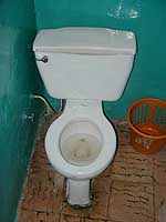 安宿のトイレと風呂 2000.5.4 いわゆる安宿と言われる所に泊まりながら旅を続けている私達ですが、その安宿に泊まったよと言う事は色々な所で書いたものの、じゃあ安宿って言うのはどんな所なのさ?と言う事はぜんぜん書いてこなかったような気がします。 安宿と言うのは、当然の事ながら宿の主人がそう思って自分の宿をそう呼んでいる訳ではなく、ただ旅行者が自分の国の物価と比較すると大幅に安いと言う事から発生した呼称です。安宿の実態は日本で言う民宿みたいな所が圧倒的に多く、物価の安い所だと1つ星や2つ星のホテルも安宿の定義の中に入ります。