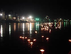 夜闇が迫ってきたらいよいよ待ちに待ったガンガープジャの時間です。私の経験で行くとガンガープジャは2から3人でやるのではなく、10人位の人を誘って行くと灯篭が連続した線になって綺麗です。 ボートに乗ったら葉っぱのお皿を広げ、そこにさっき作った素焼きの皿を火をつけて載せ、川に流します。最後に、ガンガープジャが終わったらボートマンはすぐに帰ろうとするので、帰りたくない場合は、ボートマンの行動を良く見て、帰ろうとしたら「ゆっくり灯篭を見せろ!!」とか、「灯篭に沿って漕げ!!」とかしっかり言いましょう。ボートは1時間、1人10ルピー位で借りれますが、人数によってはもっと安く借りられるので交渉してみてください。 |