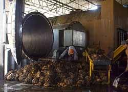 付け根を切り取ったサボテンをこの写真にある圧力釜で8から10時間ほど蒸します。10年もかけて育つサボテンなので、付け根のところはとにかく硬く、重い(100KG以上)ので、蒸すのに非常に時間がかかります。 この写真は、蒸し終わった後、これからジュースを搾り取られようとしているところです。 |