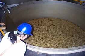 2次発酵の後に、この蒸留釜で蒸留します。蒸留によってアルコール度を高め、不純物を取り除きます。蒸気を冷却し、もう一度液体に戻すとテキーラの出来あがりです。 テキーラは、まったく置かないもの、ワインやウィスキーのように樽に入れて1から6ヶ月程置くもの、1から5年置くものの3種類があり、この工場では前述の2つを作っていると言うことでした。 |