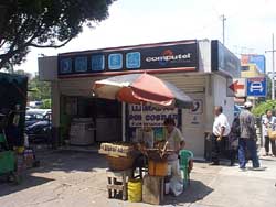 まず、ウメとKが行ったのはグアナダハラの旧バス停の近くにあるComputelと言う、いかにもインターネットに繋げそうな感じの電話屋でした。 ここは私達がテキーラに行った後発見したところで、その時にいた店員さんに話をしたら「モジュラージャックを貸してあげるわよ。」と言う話だったので、安心していたのですが…。 |