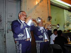 マリアッチたちは、屋外のバーや、オープンカフェなどに通常たむろしています。彼らは、お客さんから依頼があると、口笛を吹き鳴らし、そこらへんに散らばっている仲間を集め、おもむろに演奏を始めるのです。