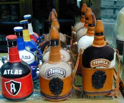 グアナファトで見つけた、首から下げる形のテキーラボトル。すべて皮と毛皮張りの高級そうな一品です。手触りも非常に良く、持っていると幸せな感情まで生まれてきます。この中にテキーラを居れて飲んだら美味いのかも?なんて思えます。 しかし実態は、そこらへんにあるプラスチックのボトルに皮と毛皮を貼り付けただけのものでした。お値段もそれなりで20ペソから30ペソでした。 |