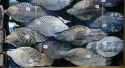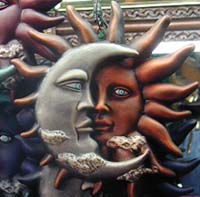 メキシコ名産(?)太陽と月。とにかくメキシコ人は太陽と月がダイスキでたまりません。太陽と月が分離しているものや、色が違うものや、大きさが違うものなどと、色々なバリエーションはあれど、とにかく太陽です。 私達が見た中で一番イカスものは、大きな銀の鏡でした。鏡の大きさは、80cmの楕円形。鏡自体の大きさは60cm位。残りの20cmの鏡の周りには、月が象眼されていて、非常にセンスが良かったのでした。私達、買えたら買おうと思って値段を聞いてみたのですが…250ペソ。日本円に換算すると2500円でした。高すぎて買えませんでした。残念です。 |