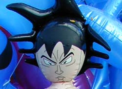 これは正確にはお土産品ではないのですが…。今、メキシコでは、ドラゴンボールが大流行です。しかし、メキシコ人はゴクウの顔を上手く書けないらしく、いっつもいびつな顔になっています。 これはそのなかでも最高傑作の一つ。いびつな顔のゴクウの等身大人形です。おちょぼ口、上につりあがったゴクウの顔は、漫画のそれとは似ても似付かず、思わず笑いを誘います。 値段は分かりませんが、10ペソ以下だと思います。 |