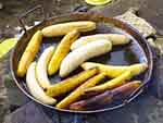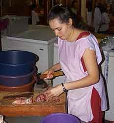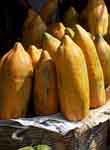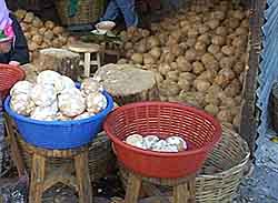 左の写真はグアテマラ、チチカステナンゴのバザール。グアテマラは、織物が非常に有名で、この写真でもそこかしこで織物を売っている様子が伺えます。ですが、基本的にはどこのバザールも売っている物が多少違うだけでこんな感じです。 中心辺りで、地面に腰掛けて売っているのは、とうもろこしを初めとする野菜類。形は日本の物と同じ形をしていても、歯ごたえ、味が全く違うのが非常に面白い所です。 例えば、私達が良く知っていると思っているトマト。日本のトマトはそのまま食べても美味しいですが、煮物にするとイマイチな所がありますね。こっちで売っているトマトは、赤く熟している様に見えても、そのまま食べるとちょっと固くて若いような感じですが、スープや煮物にするととっても美味しいのです。 私がこっちで初めてトマトをスープに使ってみたとき、その濃厚な美味しさに新鮮な感動を覚えました。一口目は食べてビックリ、二口目からどっしりとしたトマトの個性が際立つ美味しさでした。 バナナも特筆すべきものの一つです。私達が日本でバナナを食べるとき、基本的には生で食べると言う食べ方しかしませんよね。 間違っても、バナナを煮たり、揚げたり、焼いたりしては食べないはずです。煮バナナ、揚げバナナ、焼きバナナと言うものがあるなんて全く想像もしないのではないでしょうか? 中米ではバナナの料理方法はその熟し具合によって変わります。全く熟していない青いバナナは、これはニカラグア、カリブ海沿岸の人しかしないと思いますが、煮バナナにします。 煮バナナの味は、芋の味。食感もまさしく芋。私達も、初めて食べた時「これは本当にバナナ?」と何回も確かめてしまいました。それはバナナの形をしていたから煮バナナなのだと判りましたが、団子にされていたり、形が変わっていたら絶対判らなかったでしょう。 大分話がずれてしまいましたので、もとに戻りましょう。 これは、エルサルバドルの市場で見かけた塩づけ牛肉の巨大団子。大きさにして30センチ以上はありました。 これをどう料理するのかは判りませんが、非常に高いものであるのは確かです。エルサルバドルは年間平均気温が26度くらいと暑い国なので、保存用として塩漬けにしてあるのでしょう。 残念なのはエルサルバドルが非常に暑いので、これをうまく発酵させられない事.。これを樽に漬けてうまく発酵させられれば、なれ寿しみたいな物が出来あがる様な気がしてなりません。全くもって残念です。 ココナッツ。日本でもおなじみの食材ですが、さすが中米。腐るほどあります。値段はどの国でもほとんど変わりませんが、グアテマラで1個2ケツァール(30円)位と非常に安いです。 ココナッツの中には、白い果肉と、ココナッツジュースが入っていて、どちらも非常に美味です。 ココナッツを買ったら、まずココナッツジュースを飲み、大分おなかがいっぱいになった所で、ココナッツを半分に割ってもらって中の果肉をほおばると言うのが正統な食べ方でしょうか? まあ、食べ方はどうあれ、1個買ったらおやつはおろか、昼飯がわりにもなるのでお勧めです。 パパイヤ。これは暑い所のバザールに行ったらどこにでもありますが、日本ではなかなかお目にかかれません。こっちのパパイヤの大きさは大体50センチくらい。大きいものだと70センチ位はあるでしょうか。 1個買うと日本だったらとんでもない値段を取られるような気がしますが、中米だったら1個30円から高くても100円くらいと、いくらでも買える安さです。 パパイヤの見分け方はさっぱり分らないのですが、いつも買ってすぐに食べてしまうので一番熟している奴を買ってきます。大体1個で3人分は優にありますので、みんなでシェアして買っておやつにするのが美味しい食べ方です。 そして、最後に綺麗なお姉さんに登場してもらいましょう。でもなぜかこのお姉さん、魚をさばくのに斧を持っていますね。 実は、こっちのバザールで時々見かけるのですが、肉屋とか、魚屋とかで斧を持った奴がいるのです。 「何するのかなー」と思って見ていると、ニヤリとこっちを向いて斧を振り上げ…肉を切ったり、魚を切ったりしはじめます。 その様子はめちゃくちゃ豪快で、とにかく切れりゃ良いとばかりに「ガンガン」とか、「ゴンゴン」とか言う擬音が出そうな感じで切っていくのです。 肉屋一面に破片と血が飛び散っている所もしばしば。肉とか魚は、確かに食えりゃ良いのかもしれませんが、身がぐずぐずになっちゃうよなぁ、あれじゃ美味しくないよなぁとしみじみ思ってしまいました。 |