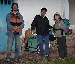 T「で、結局、50kmずつ2日間に分けて登ったんですけど、最後の方とか標高高くなって空気薄くなるし凄くきついんですよ。10m進んだらもういいやって感じで。」 U「あはは。だって、ナスカからクスコ間って4000mの峠あるでしょ? 俺らなんか3400mのここで階段登ってきついって言ってるのに、自転車で荷物持って…俺はいやだなぁ。そう言えば、なんでこのルート選んだの?」 T「ただ、アンデス登りたかったんですよ。」 U「へ?じゃあ、この4000mの峠を登りたかったんだ」 T「そうです」 U「マゾだ。(爆笑)真性マゾ。」 T「いや、チャリダーとして色々あるんですけれども、アンデスはやってみたかったんですよね」 U「他にはどんな所行ったの?」 T「ほとんど日本ばっかりですけど、南アフリカと、アジアは行って来ました」 U「それは両方ともチャリンコで?」 T「そうですね。あ、でも南アフリカまでと、アジアまではちゃんと飛行機ですよ」 U「そりゃそうだ。(笑) で、日本ではどういう所走ってたの?」 T「僕の大学が北海道だったんで、北海道が多いです。僕、大学で自転車部にいたんですよ。大学一年の頃、自転車部の先輩とかと一緒にツーリング行くじゃないですか。そうすると、先輩達って走りながら「この後ちょっとしたら自販機があるからそこで休憩しよう」とか、「この後ちょっとするとコンビニがあるから…」とか言うんで、僕凄いなぁと思ってたんですよね。」 U「うんうん。」 T「そしたら自分も4年になったらそうなってて。(笑)」 U「あはは。そうなんだ。それがあたり前になってるんだ」 T「まぁ、いつも走ってますからね。覚えるんですよ」 U「そう言えば、年にどれ位走っているの?」 T「うーーん。一年に大体5000Km位ですか」 U「5000Km!! 凄いなぁ。一日100Km走るとしても50日かかる計算だ。そう言えば、こっちに持って来た自転車は新品?」 T「いや、もう4年位走ってる奴ですね。」 U「4年と言うと…20000Km?」 T「今年に入って5000Kmくらい走ったから…25000Km位ですか」 U「凄え。下手なバイクより走ってるじゃん」 T「そうですか?」 U「そうだと思うよ。北海道って、冬の間雪降るじゃない? その時はスキーとかしてるの?」 T「スキーはしないですね。ずっとバイトとかしてます」 U「雪降るともう走れないんだ。チェーンとかないの?」 T「雪降るともう走らないですね。こけたりしてその後から車が来たら危険ですし。だから冬の間はブルーですよ」 U「走れないんじゃなくって、走らないんだ」 T「ガマンしてます。」 U「で、その自転車で日本とか世界を走りまくってると。そう言えばさ、日本って泊まる時どこに泊まってるの? キャンプ場とか?」 T「いや、キャンプ場なんか使わないですよ。僕はトイレが好きですね」 U「は? トイレ?」 T「そうです。トイレ。最近のトイレってきれいじゃないですか。一億円トイレとかあって。」 U「でも、トイレでしょ?」 T「いや、ホントに良いんですよ」 U「そうかなぁ? 信じられないなぁ。やっぱりトイレに座ったりして寝たり?」 T「そうじゃなくって。あの、男トイレと女トイレに分かれる前室があるんですけど、そこで寝るんですよ」 U「でもトイレでしょ?」 T「ホントに。今のトイレって凄くきれいなんですよ。さわやかトイレとかってどの街にも大体一つくらいあるんですけど、そこが良いんですよ。後は道の駅のトイレとかも使えますよね」 U「あ、分った。どんなトイレでも良いって訳じゃないんだ。俺、公衆便所って言うから凄く汚いの想像してた。 なんか、トイレフェチなのかなぁ?って思ってた。(笑)」 T「そんな、いくら僕だって汚いトイレは嫌ですよ。(笑)」 U「で、そんなトイレが全国にあるんだ」 T「そう、大体全国にありますね。トイレって、凄く良い所なんですよ。暖房があったりする所もあるし」 U「暖房付きなんてあるんだ」 T「あります、あります。だって、トイレって水とトイレと寝る場所があって、完璧なんですよ」 U「ああ、それはそうかもね。言われてみればもっともだ。で、きれいだと」 T「(笑) まぁ、そうですね」 U「そう言えば話かわるけど、チャリンコ重そうだよね。何キロぐらいあるの?」 T「そうですねぇ…30Kg位ですか。」 U「え? 30Kgもあるの? バイカーの人達だってそれは嫌がるヨ」 T「まぁ、トレーニングと言うことで」 U「いいんだよ、もうトレーニングなんかしなくたって。もう実践なんだから。(爆笑)」 T「そう言えばそうですね(爆笑)」