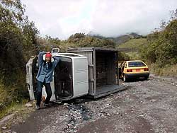 噴火していて外務省危険勧告3が出ているトゥングラウ火山を見ようと山に登ったら、ガス運搬車が横転していた(エクアドル、バニョス 2000.5.22)