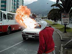 キトの街中で火吹き男を発見。燃料はディーゼル燃料だとか(エクアドル、キト 2000.5.28)