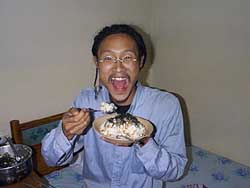 日本から送ってもらった荷物で五目ご飯。いっただっきまーす。(^_^)(コパン 1999.12.5)