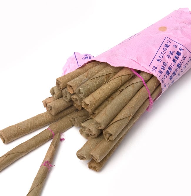 ビディは天日でよく乾かしたたばこ葉をこまかく潰し、それをテンドウの葉っぱで巻いたという至って簡単な作りのたばこです。このテンドウの葉は日本では黒壇と呼ばれており、カキノキ科に属する木。