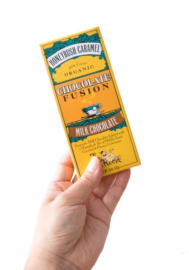 オーガニックチョコレート - ハニー ブッシュ キャラメル は、スッキリしたハニーブッシュにまろやかで濃厚なキャラメルがマッチするミルクチョコレート。この一枚に約一杯分のお茶やフルーツ&ハーブティーが含まれた今までにない新感覚ティーブレンドオーガニックチョコレート。