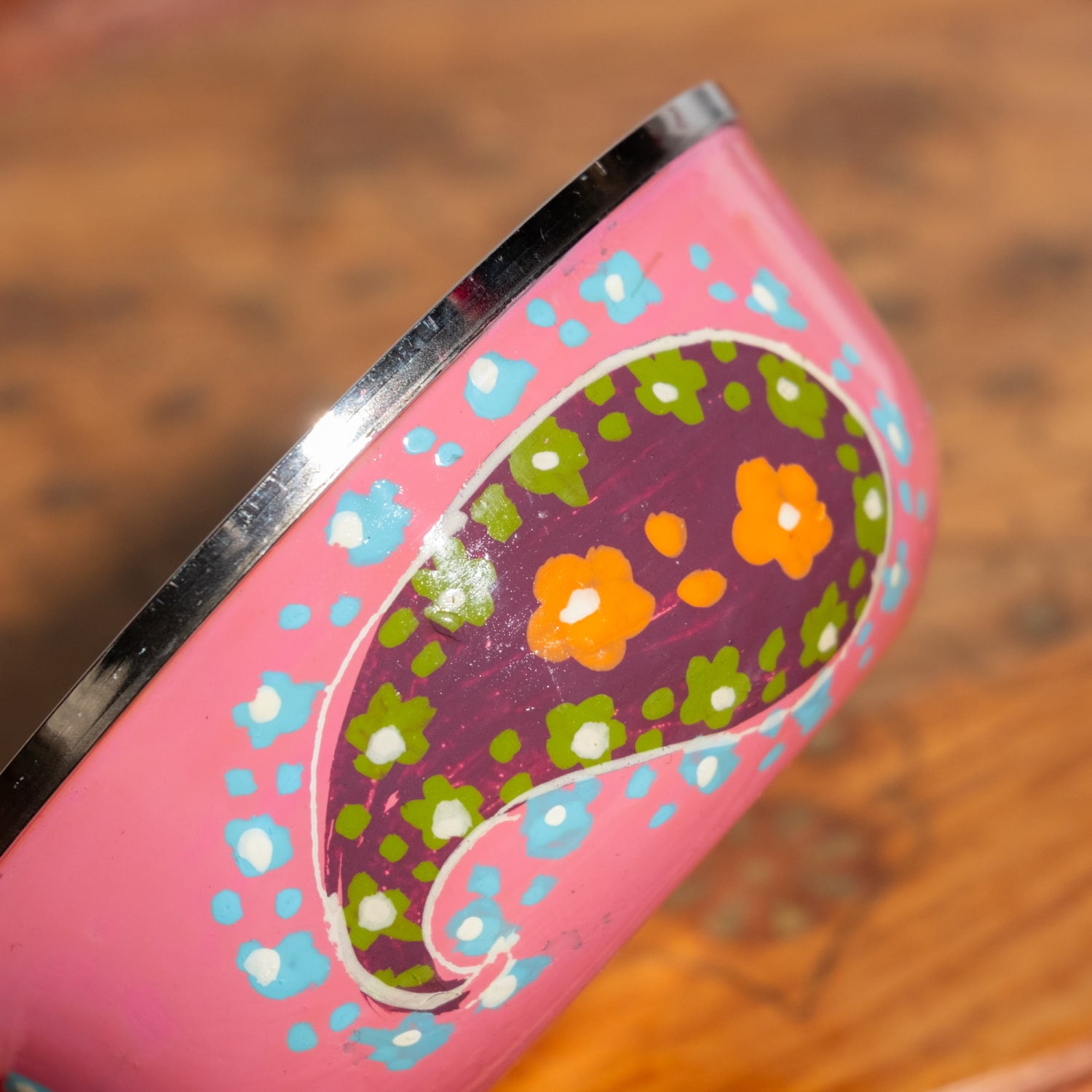 そんな伝統息づくカシミールで、職人たちがコップやカレー皿などの食器に、手描きしているのがこちらの製品です。デザインのモチーフには、花や更紗模様、アラベスクなどが取り入れられ、ペルシャの影響を強く受けています。鳥や魚なども描かれますが、基本的に人間は描かれません。カシミールの雄大な山々、美しい湖。周りを取り巻く豊かな自然の中で育まれた芸術品です。
