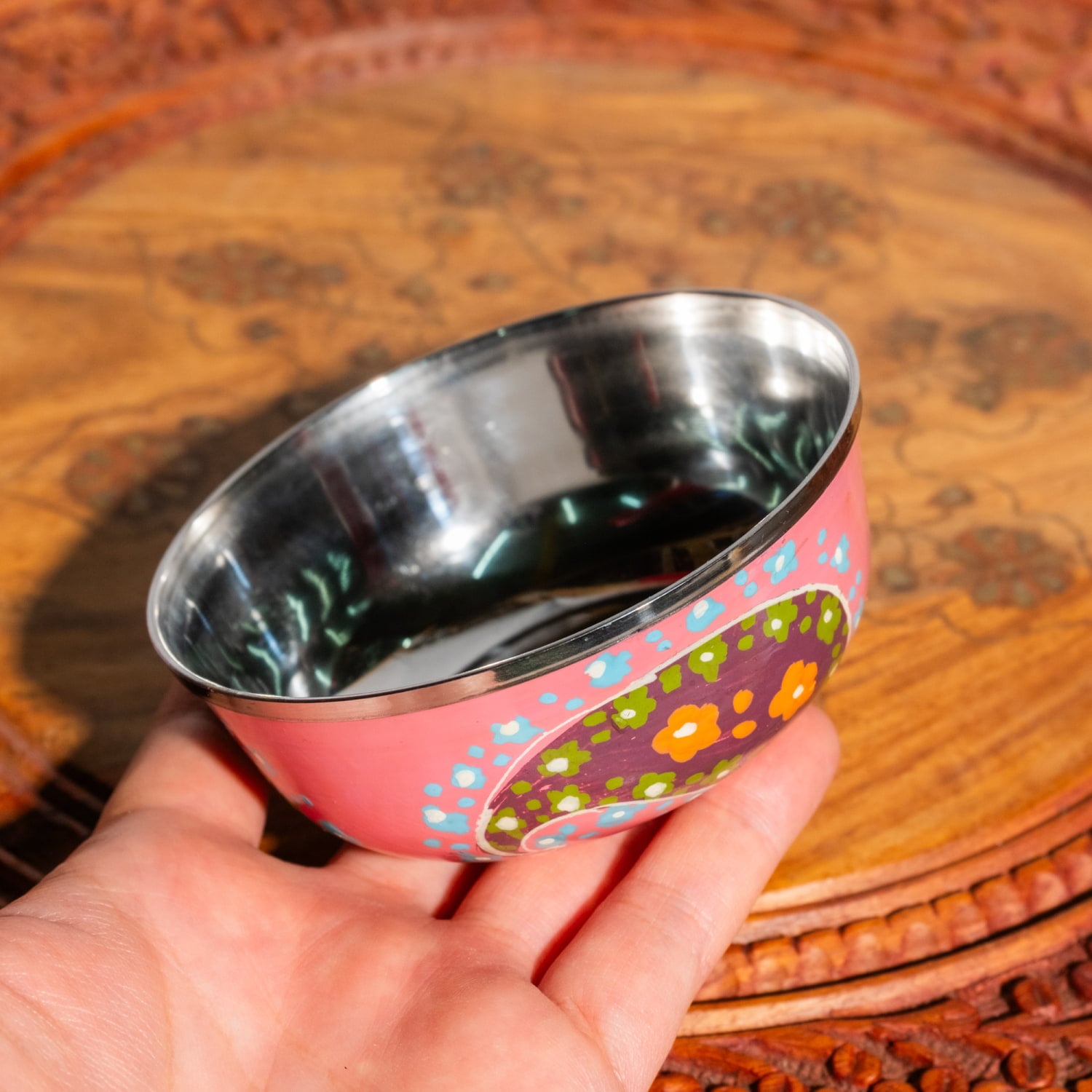 きちんとした厚みのある、ステンレスのいい商品です。手書きの模様が最高にかわいい。自宅でカレーをすることがあまりないため、小物皿にしています。しっかりした作りなのでもちろんタイトル通りカレー小皿にも合いそうです。写真は底の方も見たい方のためにあえて逆さにしてみました。