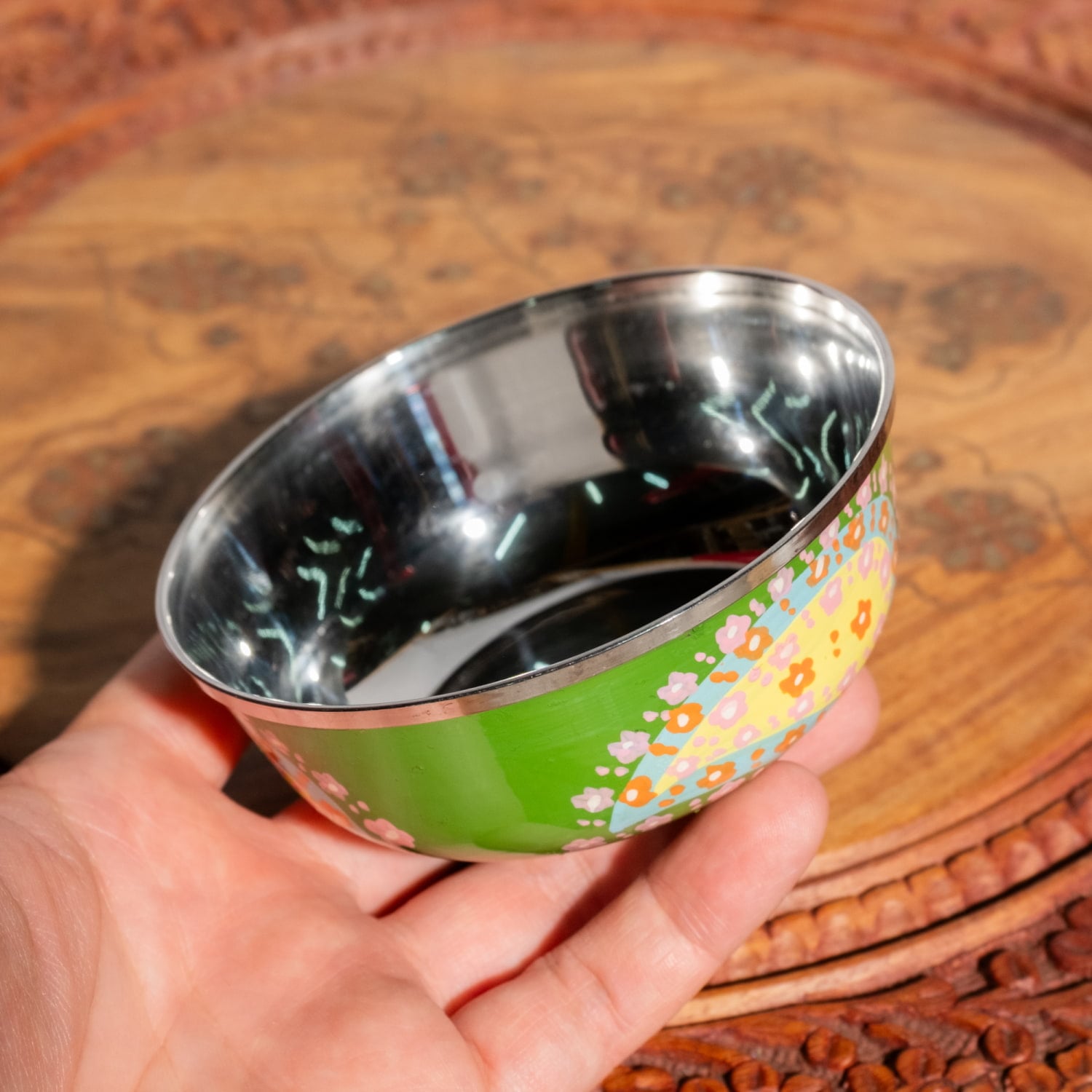 きちんとした厚みのある、ステンレスのいい商品です。手書きの模様が最高にかわいい。自宅でカレーをすることがあまりないため、小物皿にしています。しっかりした作りなのでもちろんタイトル通りカレー小皿にも合いそうです。写真は底の方も見たい方のためにあえて逆さにしてみました。