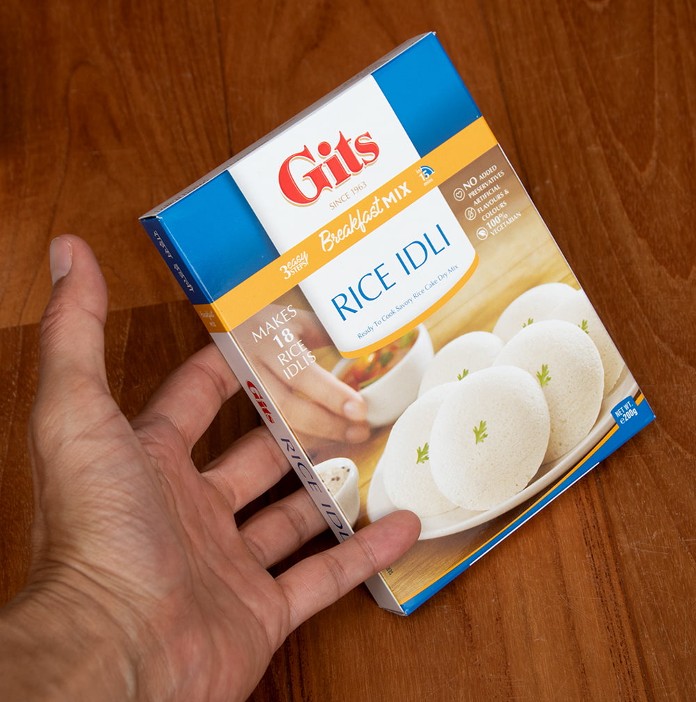 手に持ってみました。この一箱で30g(直径5-6cm)のイドリーが18個作れます。