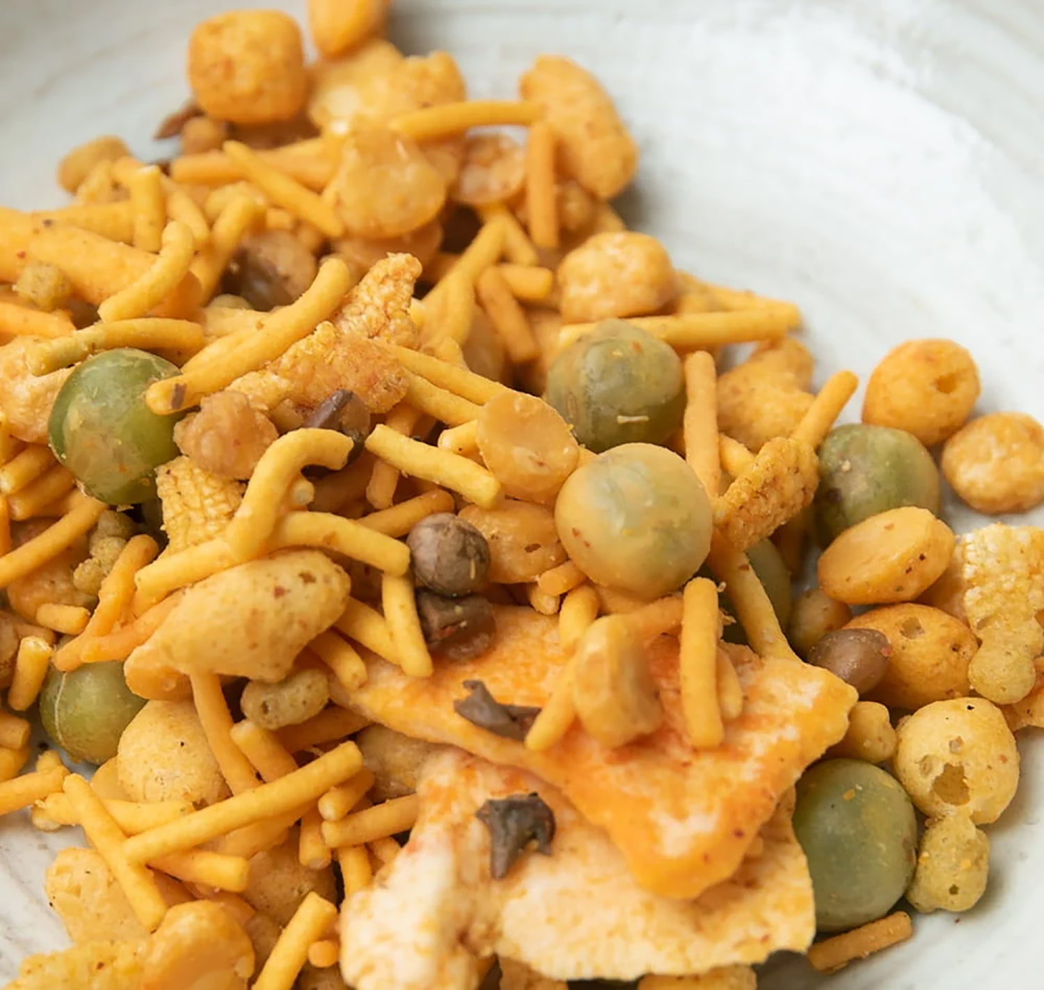 揚げたお豆、ポン菓子、ナッツ、ベビースターみたいなスナックなど、いろいろなものが混ざったインド風スナックのナムキン「ミクスチャー」です。お豆が多いので食べた時にしっかりとした食べごたえがあり、そこにカレー味のスパイシーさが加わった、味わい深くて複雑な食感のスナックです。辛いだけではない、なんとも言えない美味しさがありますよ。